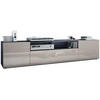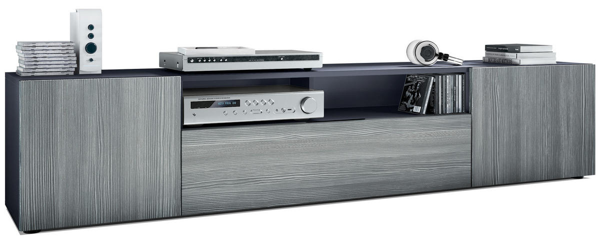 Praktisches TV Board mit zwei Türen, einer Klappe und einem offenen Bereich, welcher perfekt für Receiver, Konsolen oder andere technische Geräte geeignet ist