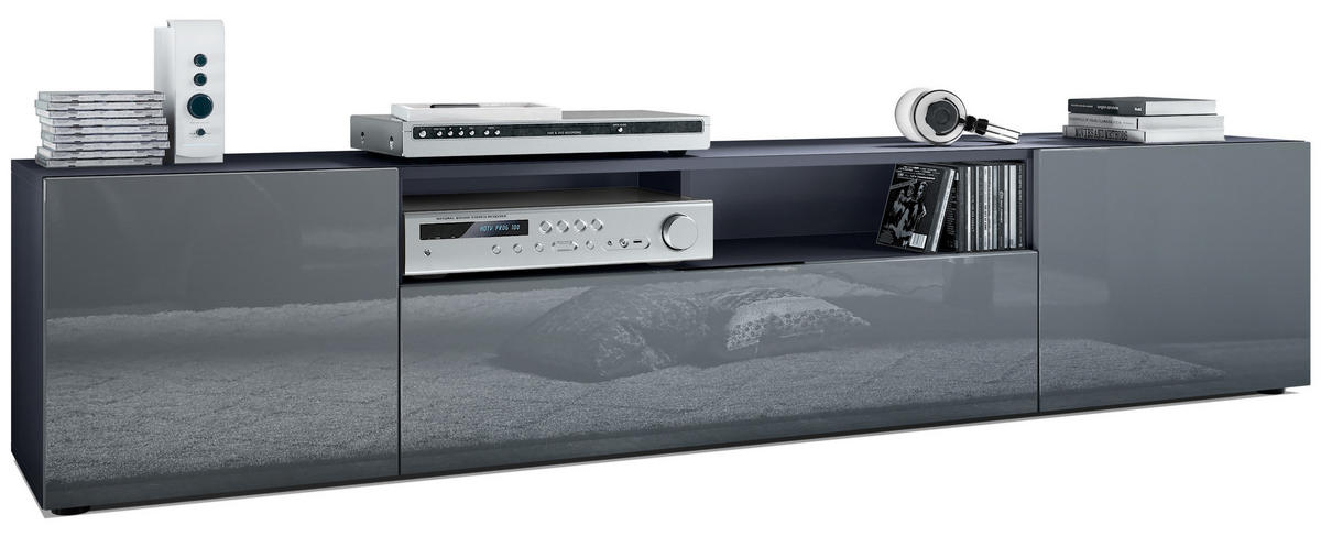 Hübsch anzusehen: Elegantes Design mit Griffmulden statt Griffen, um die glatte Optik zu bewahren; Äußerer Korpus in Anthrazit matt, Fronten in Grau Hochglanz aus MDF