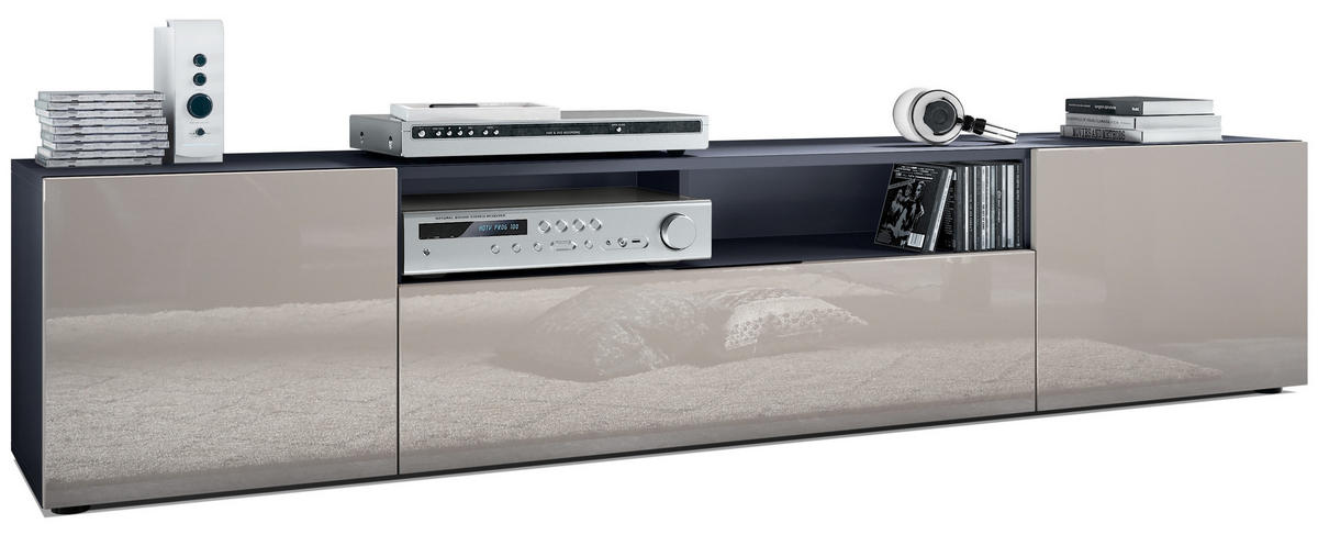 Hübsch anzusehen: Elegantes Design mit Griffmulden statt Griffen, um die glatte Optik zu bewahren; Äußerer Korpus in Anthrazit matt, Fronten in Sandgrau Hochglanz aus MDF