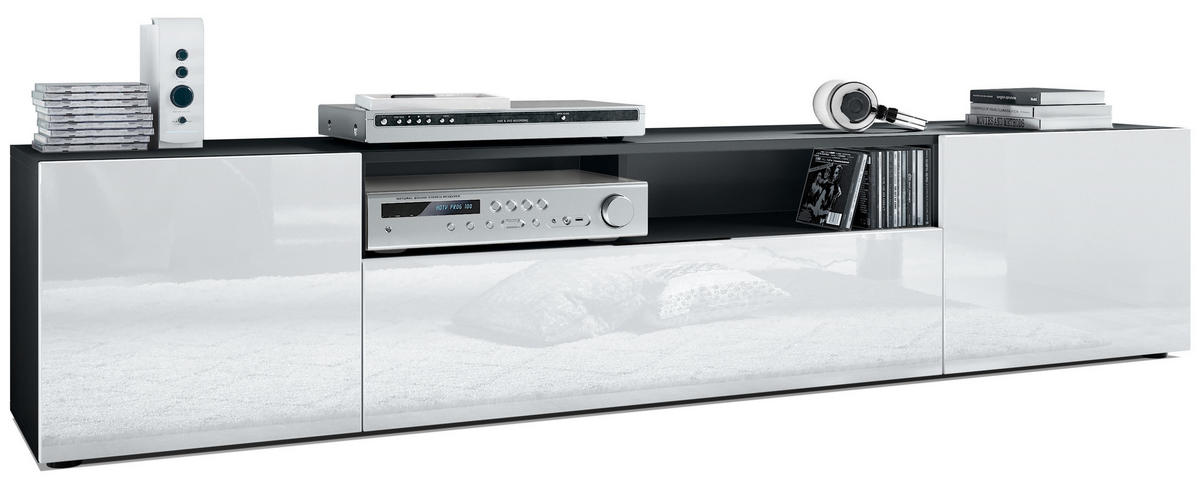 Design: Der Korpus des TV-Unterschranks in Schwarz matt und die Fronten in Weiß Hochglanz sorgen für ein modernes, wohnliches Ambiente. Oder wählen Sie aus vielen, weiteren Farbkombinationen das passende Design.