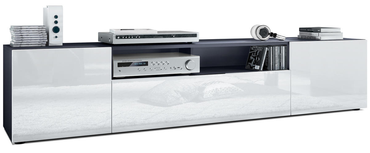 Praktisches TV Board mit zwei Türen, einer Klappe und einem offenen Bereich, welcher perfekt für Receiver, Konsolen oder andere technische Geräte geeignet ist