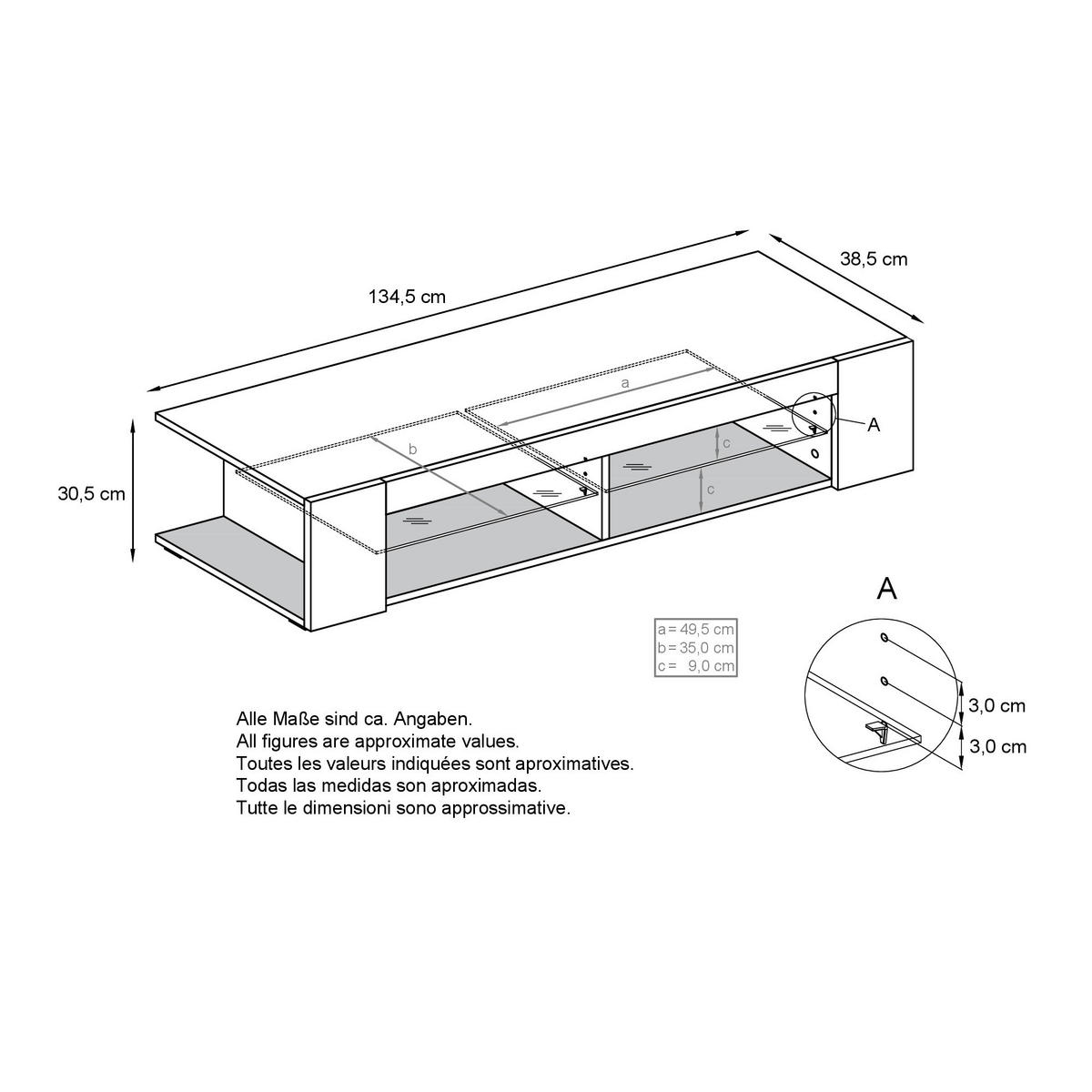 Lieferumfang: Enthalten ist das Fernsehboard inkl. LED-Beleuchtung, eine detaillierte bebilderte Anleitung und das notwendige Montagematerial. Schneller und einfacher Aufbau garantiert! Maße der TV-Kommode in cm (BxHxT): 134 x 29 x 39