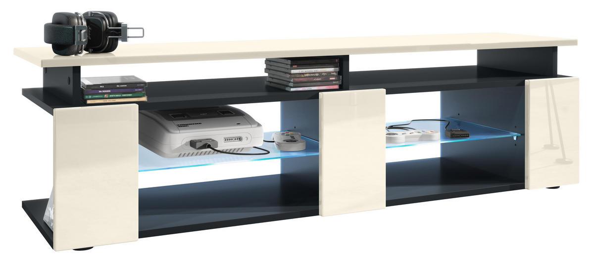 Äußerer Korpus in Schwarz matt, Zierleisten sowie Game Aufsatz in Creme Hochglanz aus MDF mit abgerundeten Kanten zum Schutze von Kindern und Haustieren; Leuchtfarbe der zwei LED-Clips ist Blau