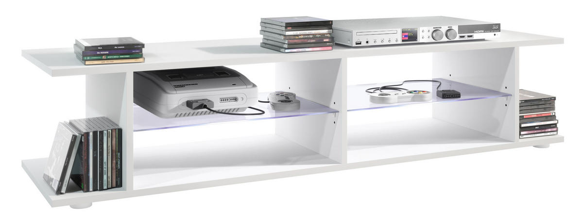 TV Board mit insgesamt 6 offenen Fächern: die 4 vorderen bieten sich hervorragend zum Verstauen von Receiver und Spielkonsolen an, die 2 seitlichen für z.B. Blu-Rays, DVDs, Zeitschriften und Bücher