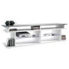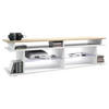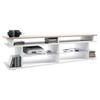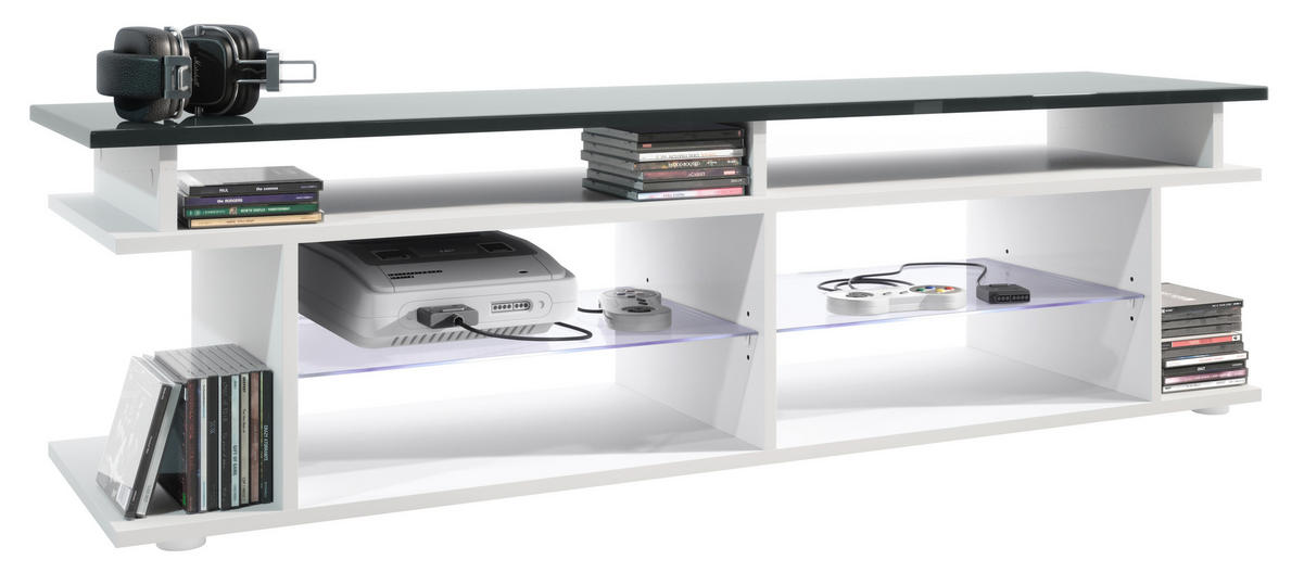 TV Board mit insgesamt 6 offenen Fächern: die 4 vorderen bieten sich hervorragend zum Verstauen von Receiver und Spielkonsolen an, die 2 seitlichen für z.B. Blu-Rays, DVDs, Zeitschriften und Bücher