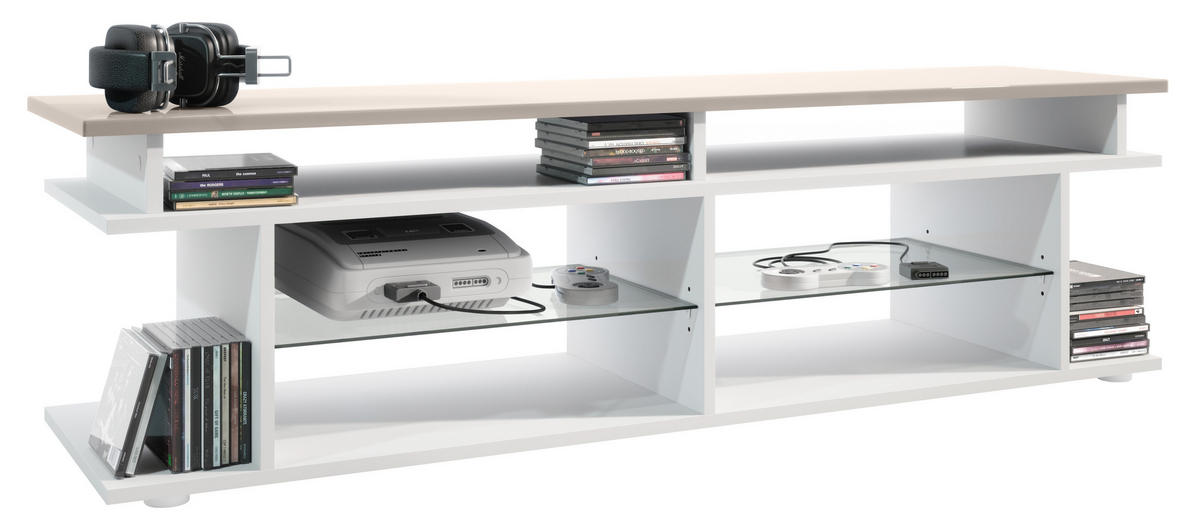 TV Board mit insgesamt 6 offenen Fächern: die 4 vorderen bieten sich hervorragend zum Verstauen von Receiver und Spielkonsolen an, die 2 seitlichen für z.B. Blu-Rays, DVDs, Zeitschriften und Bücher