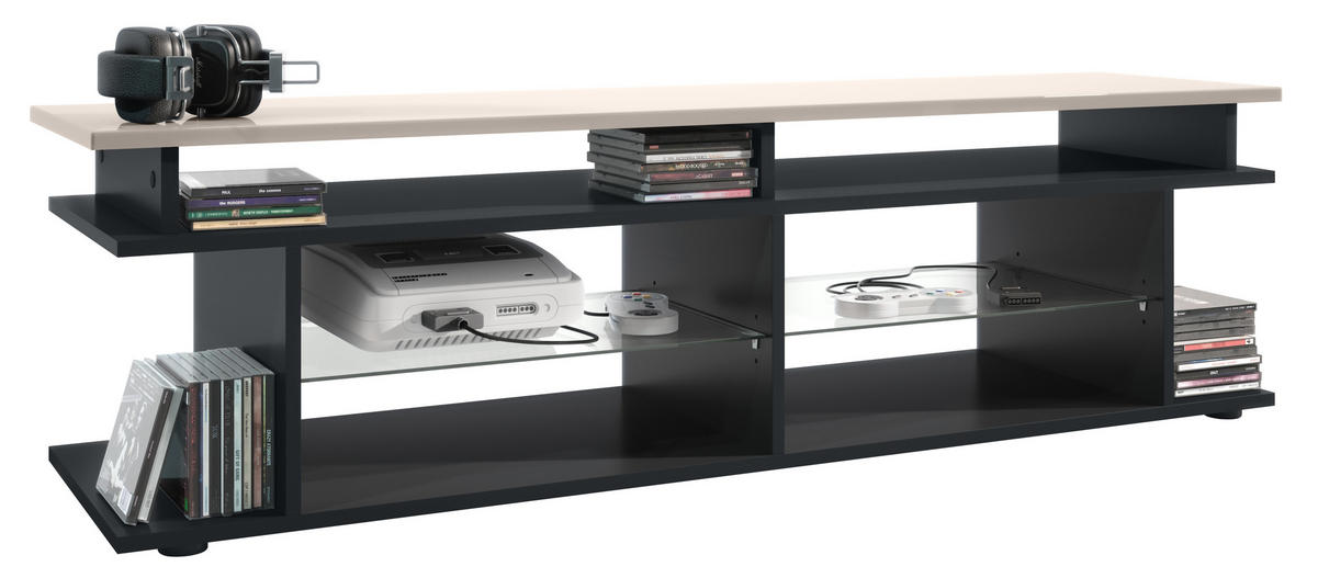 Multifunktionales Lowboard in modernem Design: mit seinem minimalistischen Korpus und den eleganten, schmalen Glasablagen passt dieser Fernsehtisch optisch in jeden Raum; inkl. Monitorerhöhung Game