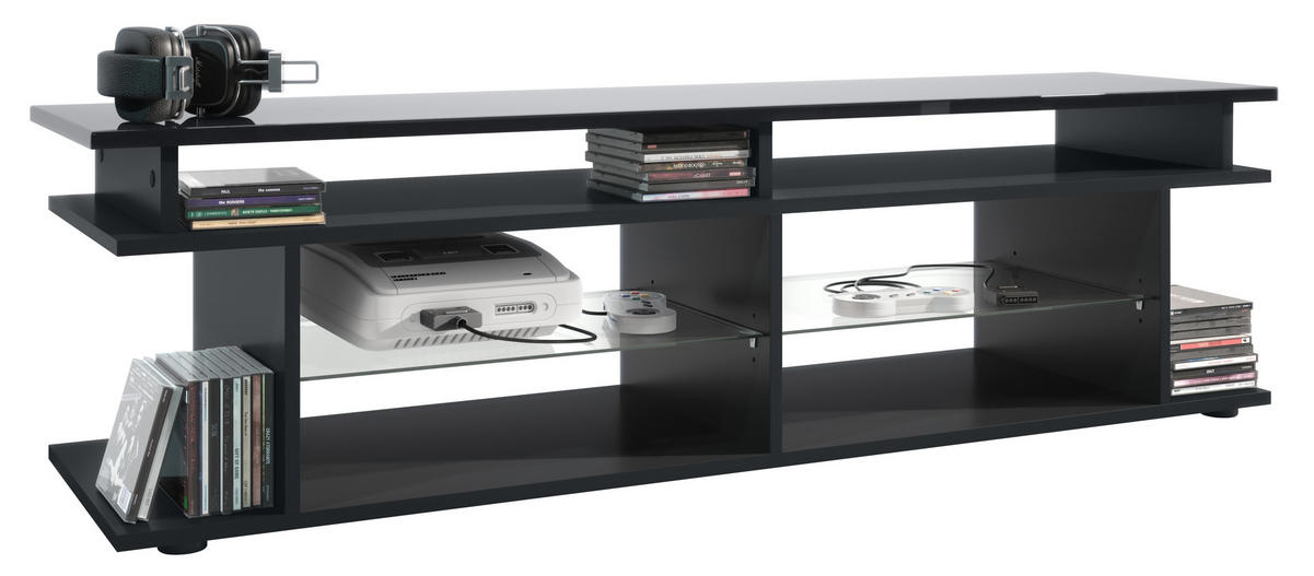 TV Board mit insgesamt 6 offenen Fächern: die 4 vorderen bieten sich hervorragend zum Verstauen von Receiver und Spielkonsolen an, die 2 seitlichen für z.B. Blu-Rays, DVDs, Zeitschriften und Bücher