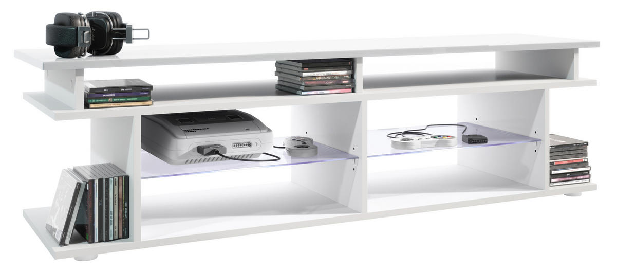 TV Board mit insgesamt 6 offenen Fächern: die 4 vorderen bieten sich hervorragend zum Verstauen von Receiver und Spielkonsolen an, die 2 seitlichen für z.B. Blu-Rays, DVDs, Zeitschriften und Bücher