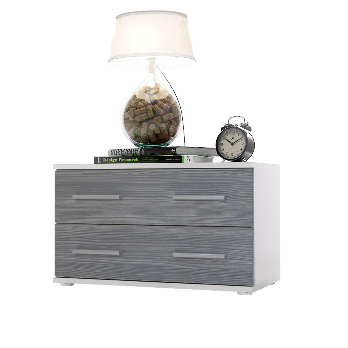 Stauraum: Der moderne Nachttisch mit Schubladen und einer Rückwand in Holzoptik aus Hartfaserplatten ist ein wahres Platzwunder - 2 große Schubkästen bieten viel Stauraum für allerlei Gegenstände.