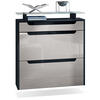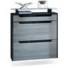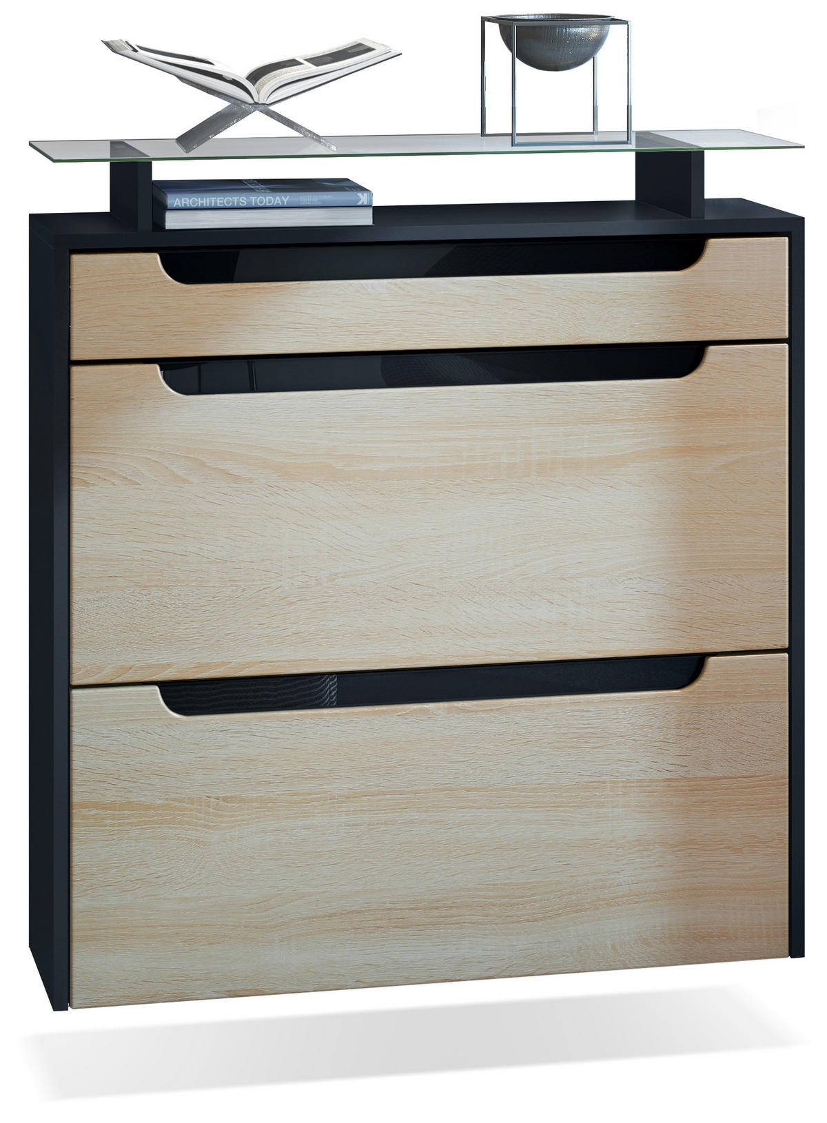 Design: Der Korpus der Schuhkommode in Schwarz matt, die Fronten in Eiche Sägegrau und die Absetzungen in Schwarz Hochglanz sorgen für ein modernes, wohnliches Ambiente. Oder wählen Sie aus vielen, weiteren Farbkombinationen das passende Design.