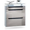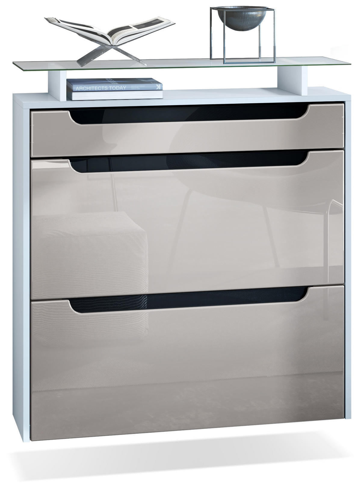 Design: Der Korpus der Schuhkommode in Weiß matt, die Fronten in Sandgrau Hochglanz und die Absetzungen in Schwarz Hochglanz sorgen für ein modernes, wohnliches Ambiente. Oder wählen Sie aus vielen, weiteren Farbkombinationen das passende Design.