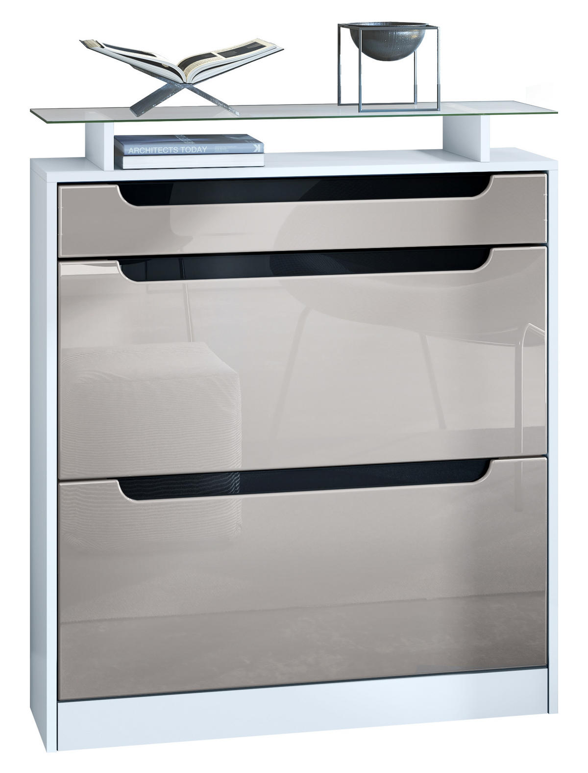 Design: Der Korpus der Schuhkommode in Weiß matt und die Fronten in Sandgrau Hochglanz, Griffmulden in Schwarz Hochglanz sorgen für ein modernes, wohnliches Ambiente. Oder wählen Sie aus vielen, weiteren Farbkombinationen das passende Design.