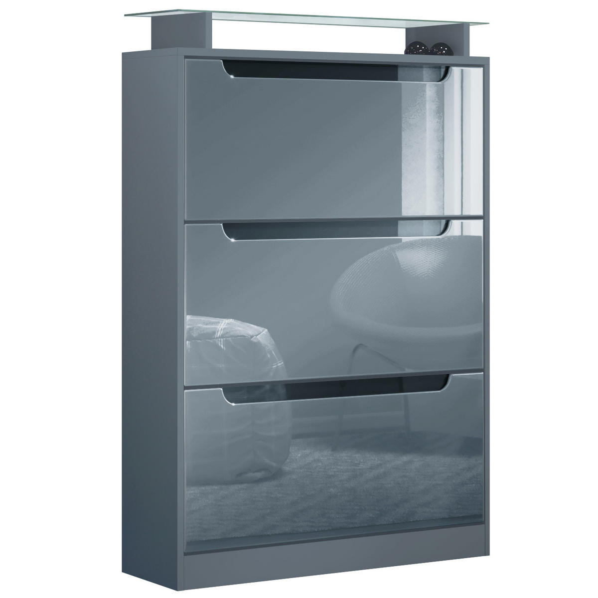 Design: Der Korpus der Schuhkommode in Anthrazit matt und die Fronten in Grau Hochglanz sorgen für ein modernes, wohnliches Ambiente. Der gläserne Aufsatz bringt Dekorationen wunderbar zur Geltung.