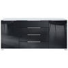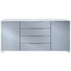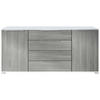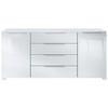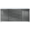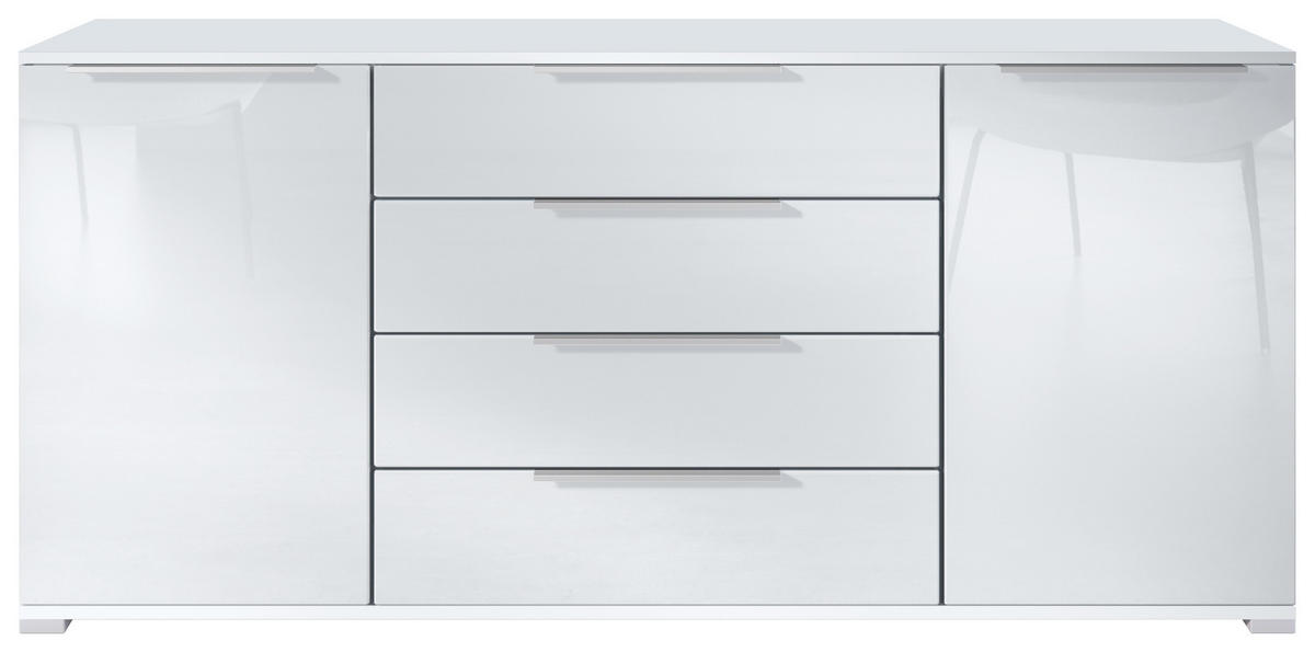 Modern, praktisch und hübsch: Sowohl die 4 Schubladen als auch die zwei Türen des Linio V2 Sideboards sind mit 30 cm langen silbergrauen Winkelgriffen aus Metall verziert.
