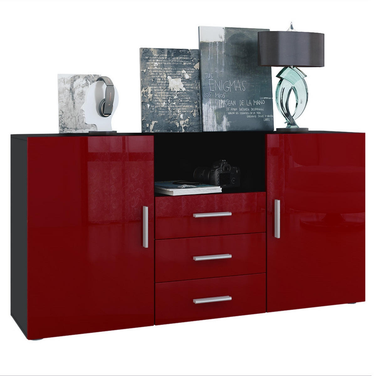 Design: Der Korpus der Kommode in Schwarz matt und die Fronten in Bordeaux Hochglanz sorgen für ein modernes, wohnliches Ambiente. Oder wählen Sie aus vielen, weiteren Farbkombinationen das passende Design.