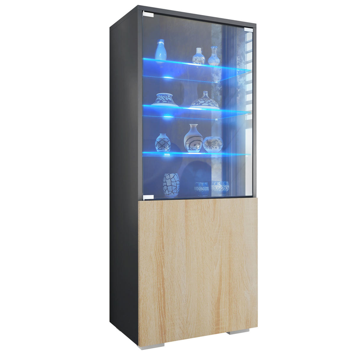 Design: Der Korpus der Vitrine in Anthrazit matt und die Fronten in Eiche sägerau sorgen für ein modernes, wohnliches Ambiente. Oder wählen Sie aus vielen, weiteren Farbkombinationen das passende Design.