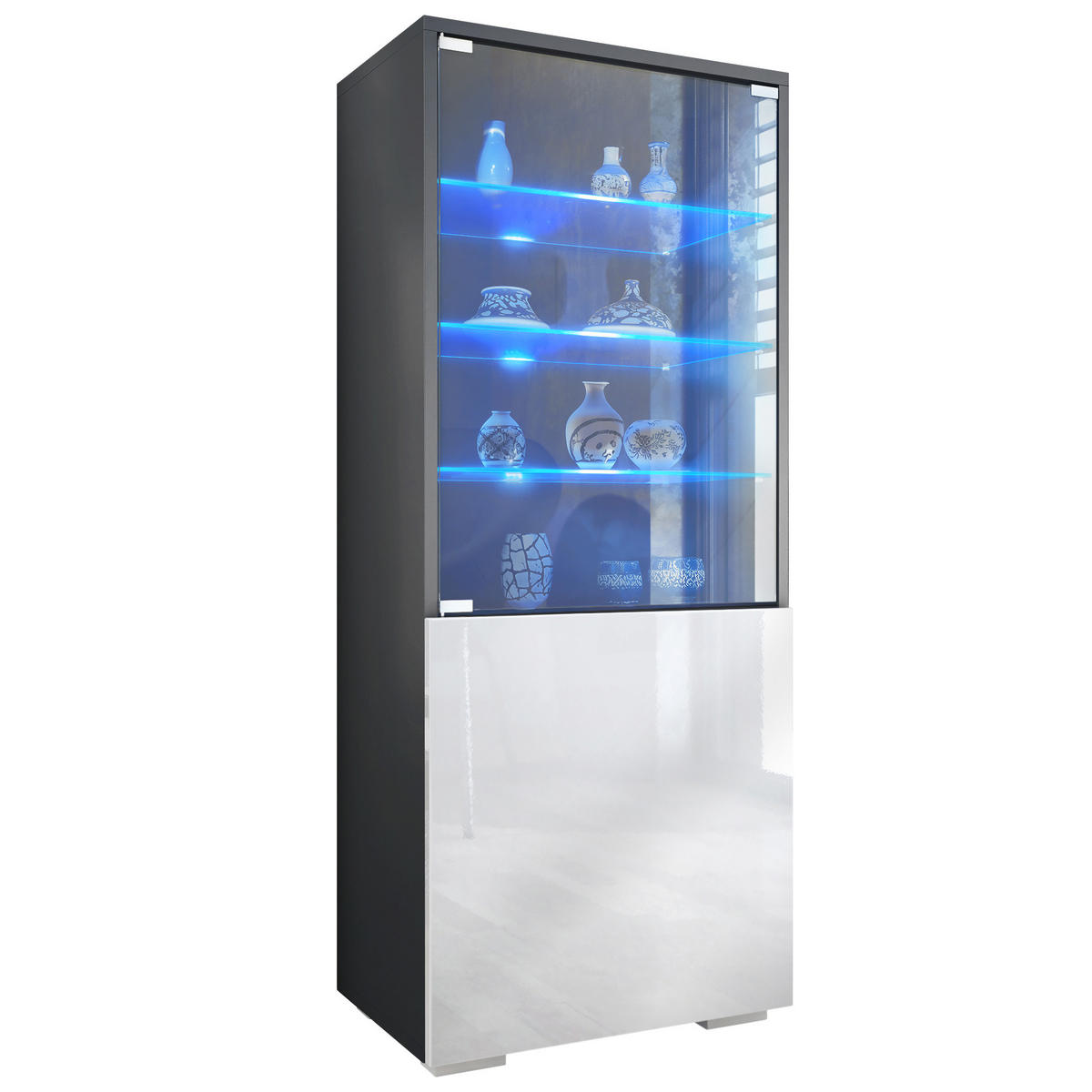 Design: Der Korpus der Vitrine in Anthrazit matt und die Fronten in Weiß Hochglanz sorgen für ein modernes, wohnliches Ambiente. Oder wählen Sie aus vielen, weiteren Farbkombinationen das passende Design.