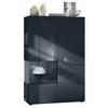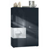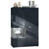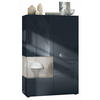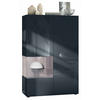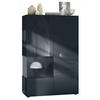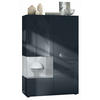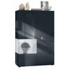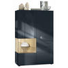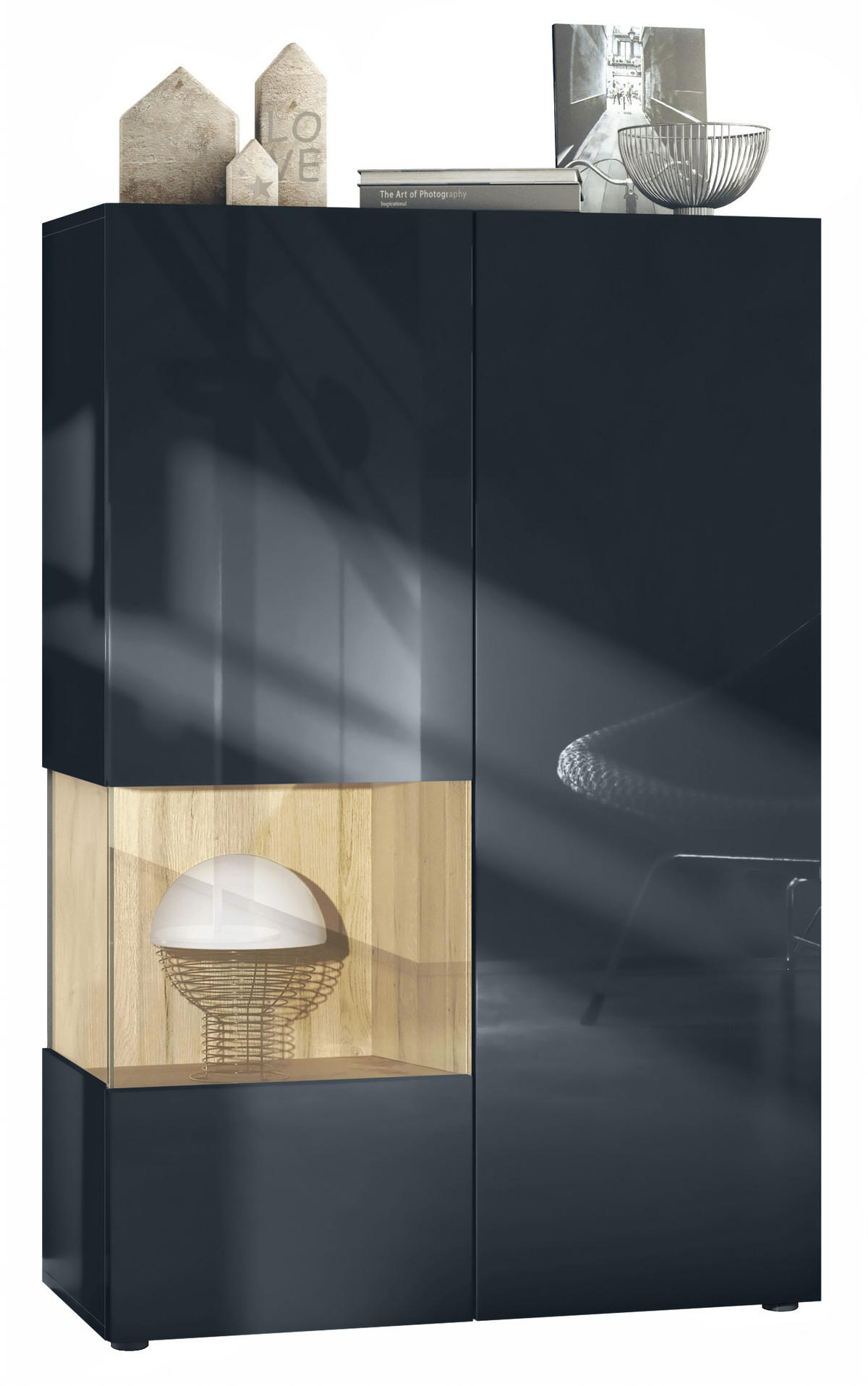 Design: Die hochglänzenden Fronten in Schwarz Hochglanz verleihen dem Möbelstück Eleganz. Der hinter den Glasscheiben sichtbare Cube in Eiche Natur ist auch in anderen Farben erhältlich. Der Korpus der Vitrine ist Schwarz matt.