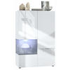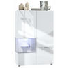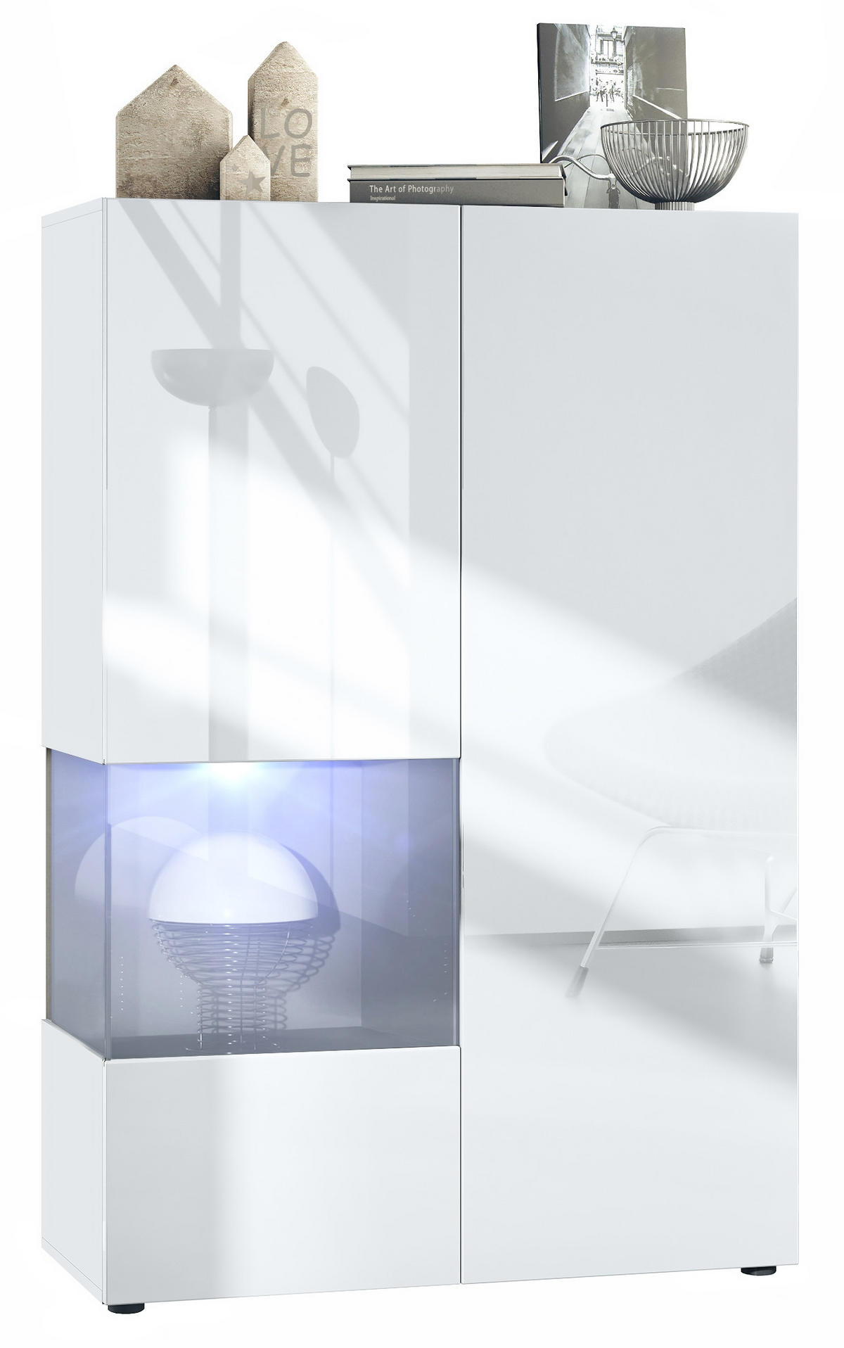 Design: Die hochglänzenden Fronten in Weiß Hochglanz verleihen dem Möbelstück Eleganz. Der hinter den Glasscheiben sichtbare Cube in Grau Hochglanz ist auch in anderen Farben erhältlich. Der Korpus der Vitrine ist Weiß matt.