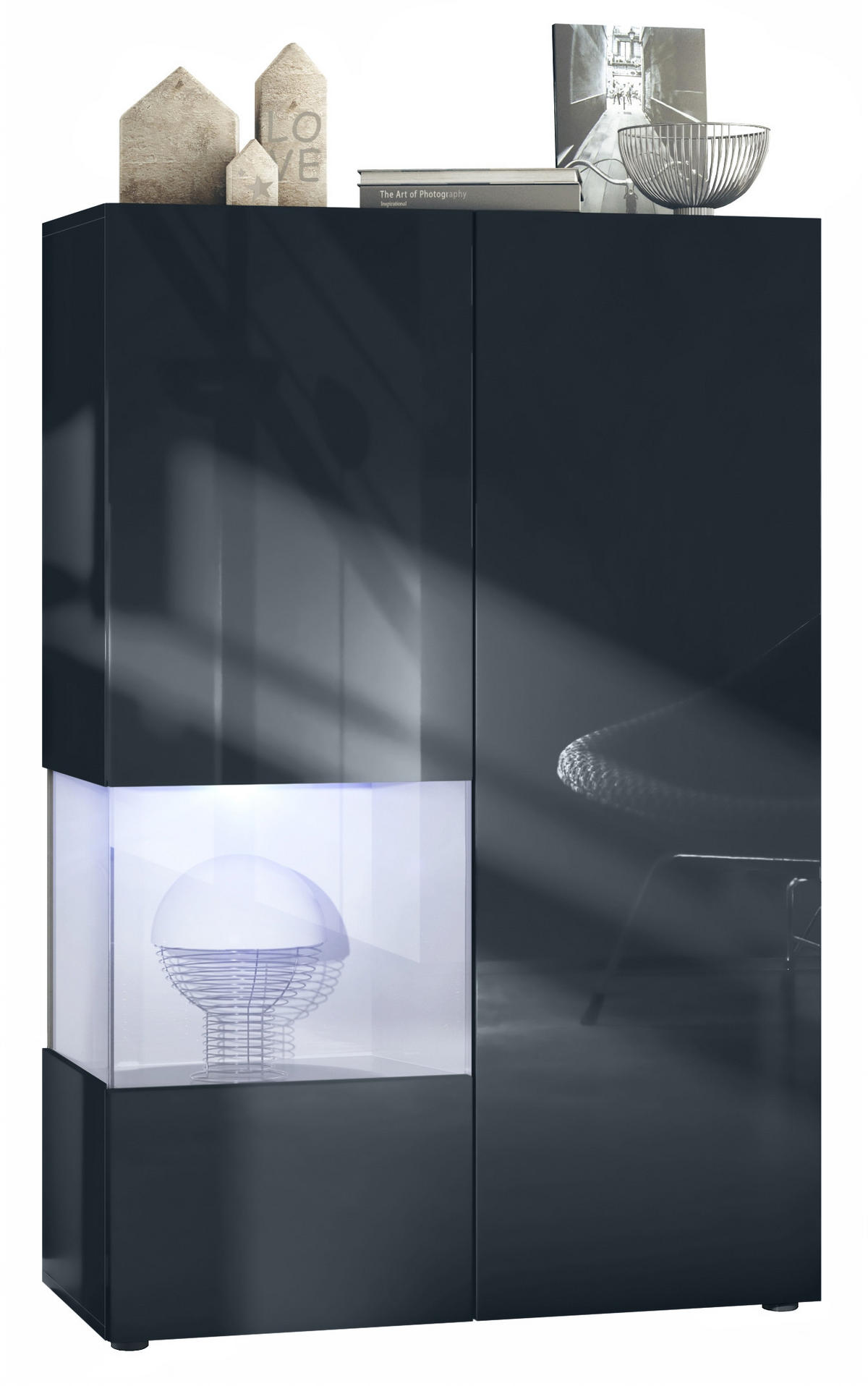 Design: Die hochglänzenden Fronten in Schwarz Hochglanz verleihen dem Möbelstück Eleganz. Der hinter den Glasscheiben sichtbare Cube in Weiß matt ist auch in anderen Farben erhältlich. Der Korpus der Vitrine ist Schwarz matt.