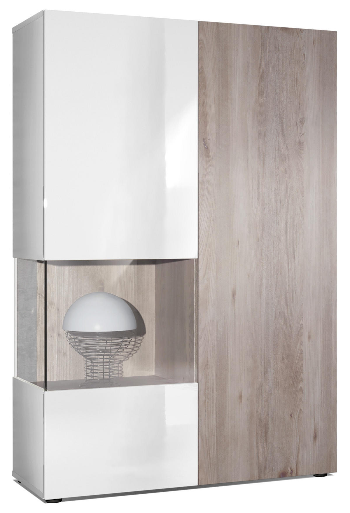 Design: Die hochglänzende Tür mit Glaseinsatz in Weiß Hochglanz verleiht dem Möbelstück Eleganz. Der hinter den Glasscheiben sichtbare Cube in Eiche Nordic und die große Tür sind auch in anderen Farben erhältlich. Der Korpus der Vitrine ist Weiß matt.