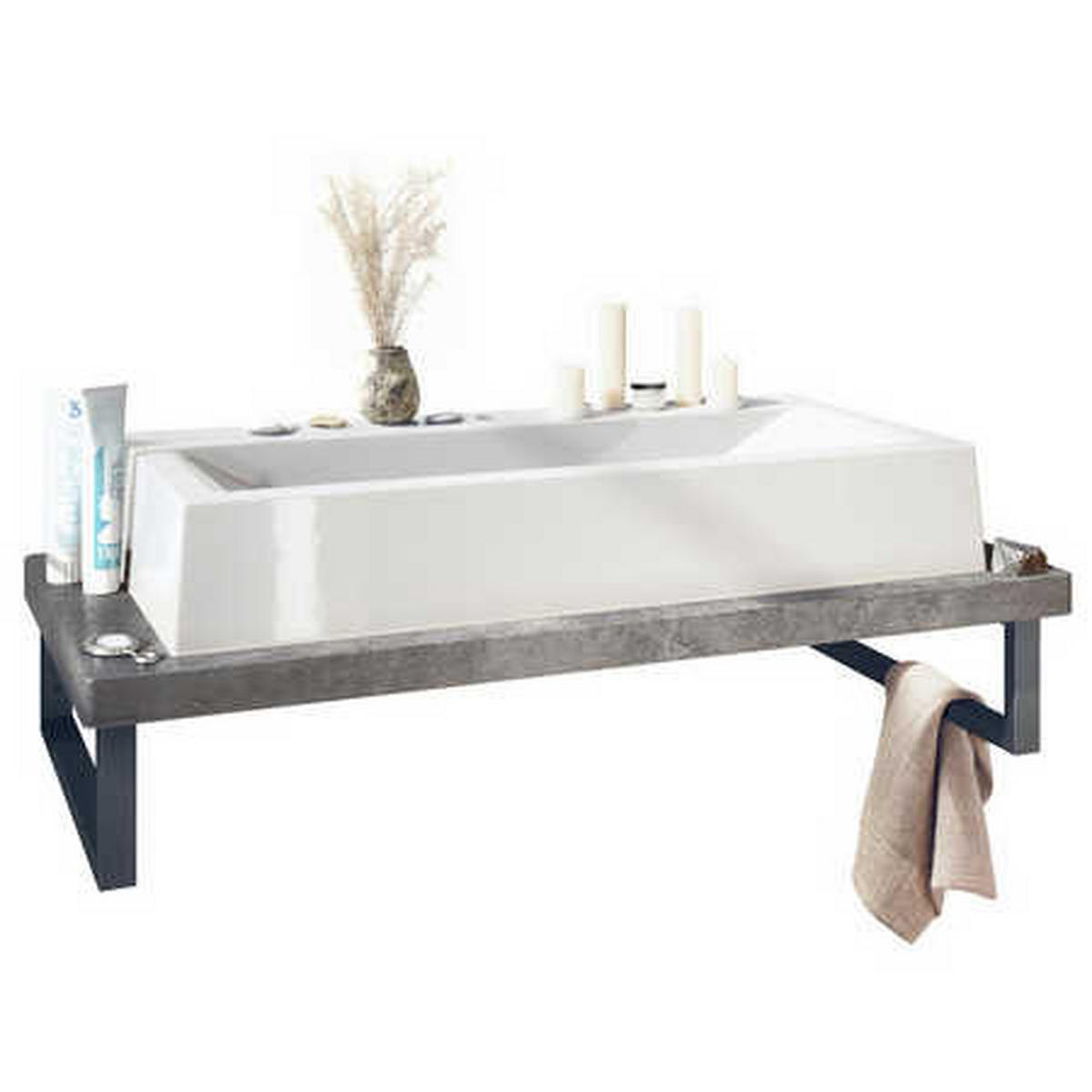 Funktionalität: Mit seinem durchdachten Design ermöglicht das Set eine effiziente Nutzung des Badezimmers. Die Waschtischplatte und Metallkonsolen bieten genug Platz für Handtücher, Pflegeprodukte und andere Badaccessoires.