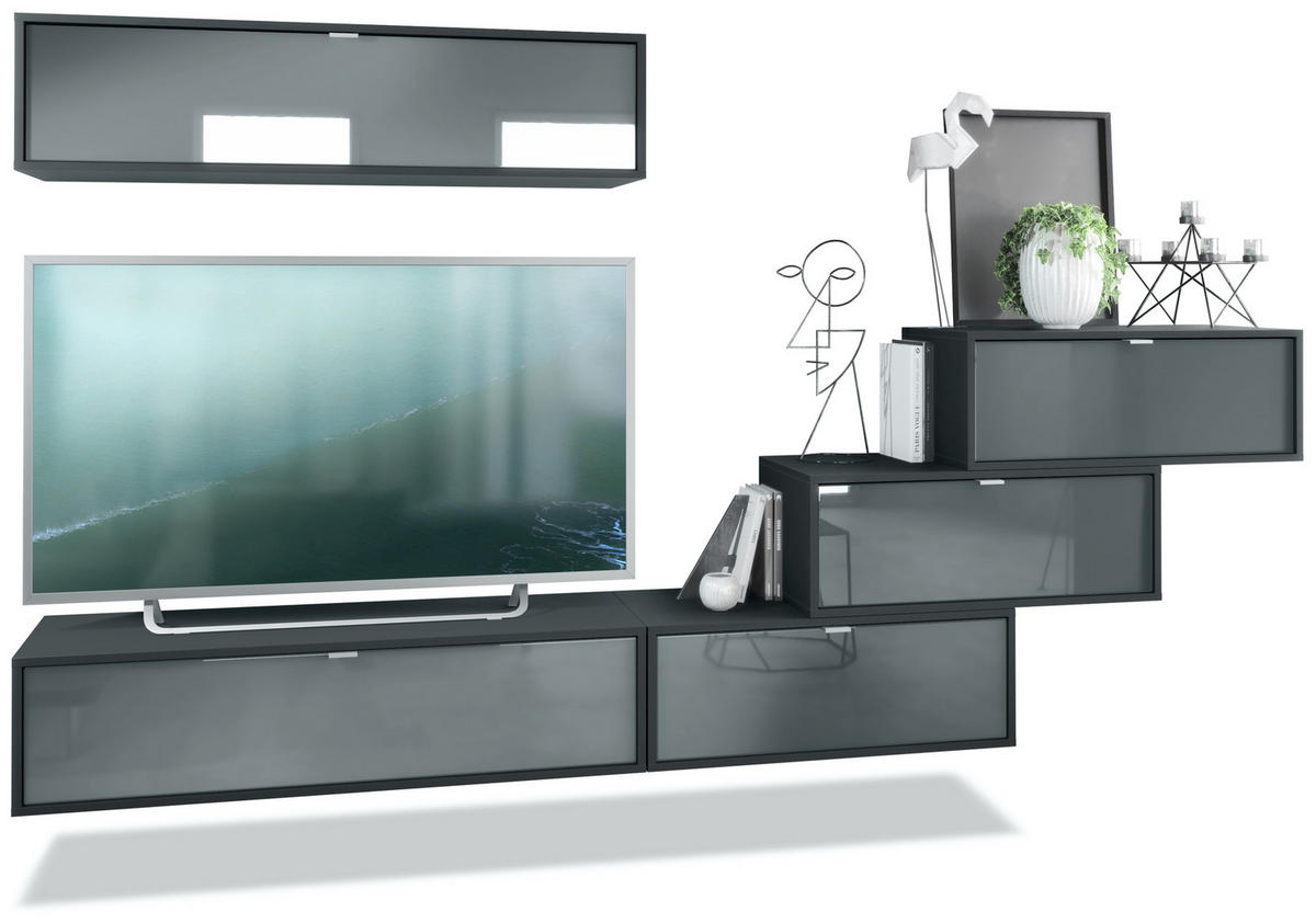 Moderne Wohnwand bestehend aus 5 Wandschränken, allesamt ausgestattet mit einer Klappe, die sich durch einen Aluminiumgriff öffnen lässt