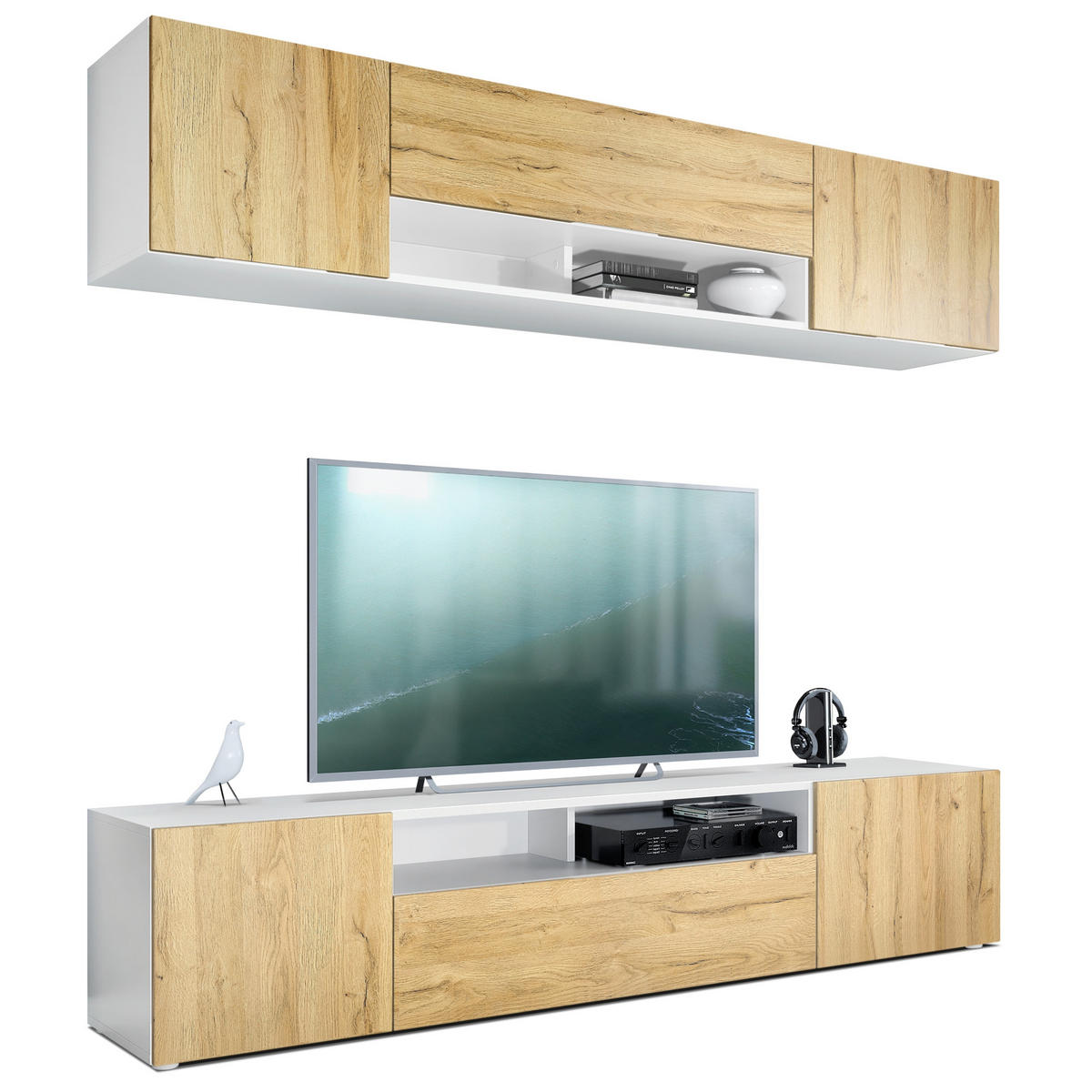 Design: Der Korpus der TV-Wand in Weiß matt und die Fronten in Eiche Natur sorgen für ein modernes, wohnliches Ambiente. Oder wählen Sie aus vielen, weiteren Farbkombinationen das passende Design.