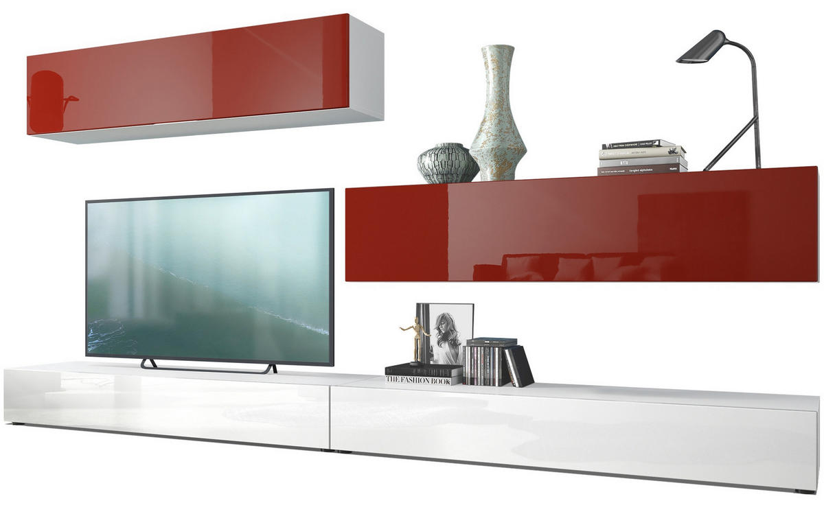 Design: Der Korpus der Schrankwand in Weiß matt und die Fronten in Weiß Hochglanz und Bordeaux Hochglanz sorgen für ein modernes, wohnliches Ambiente. Oder wählen Sie aus vielen, weiteren Farbkombinationen das passende Design.