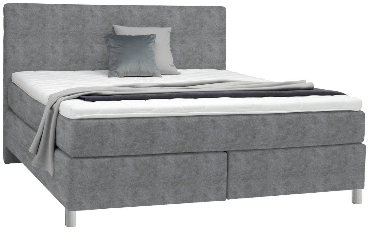 Chromfarben. Stellen Sie mit diesem Boxspringbett (ca. 200 x 200 cm) in Grau inklusive Matratzen, Topper und gepolstertem Kopfteil die Weichen auf Behaglichkeit!