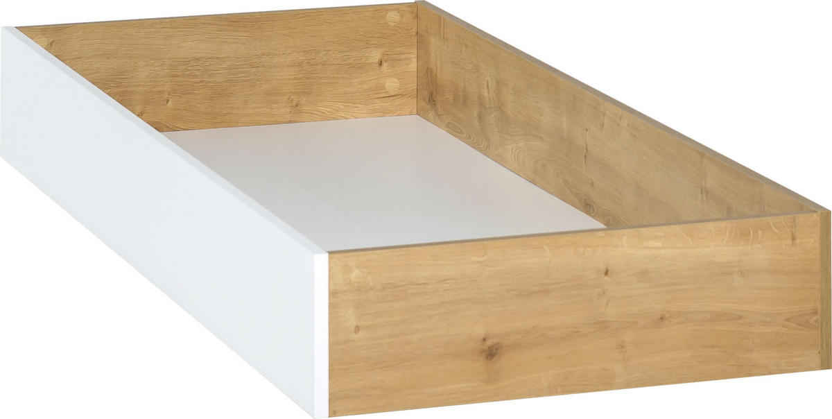 Die Bettschublade aus der Kollektion NATURE hat zwei Frontfarben: Weiß und Eichenfurnier. Dadurch kann die an der Bettkante hervorstehende Seite farblich an die Vorderseite des Nachttisches angepasst sein.