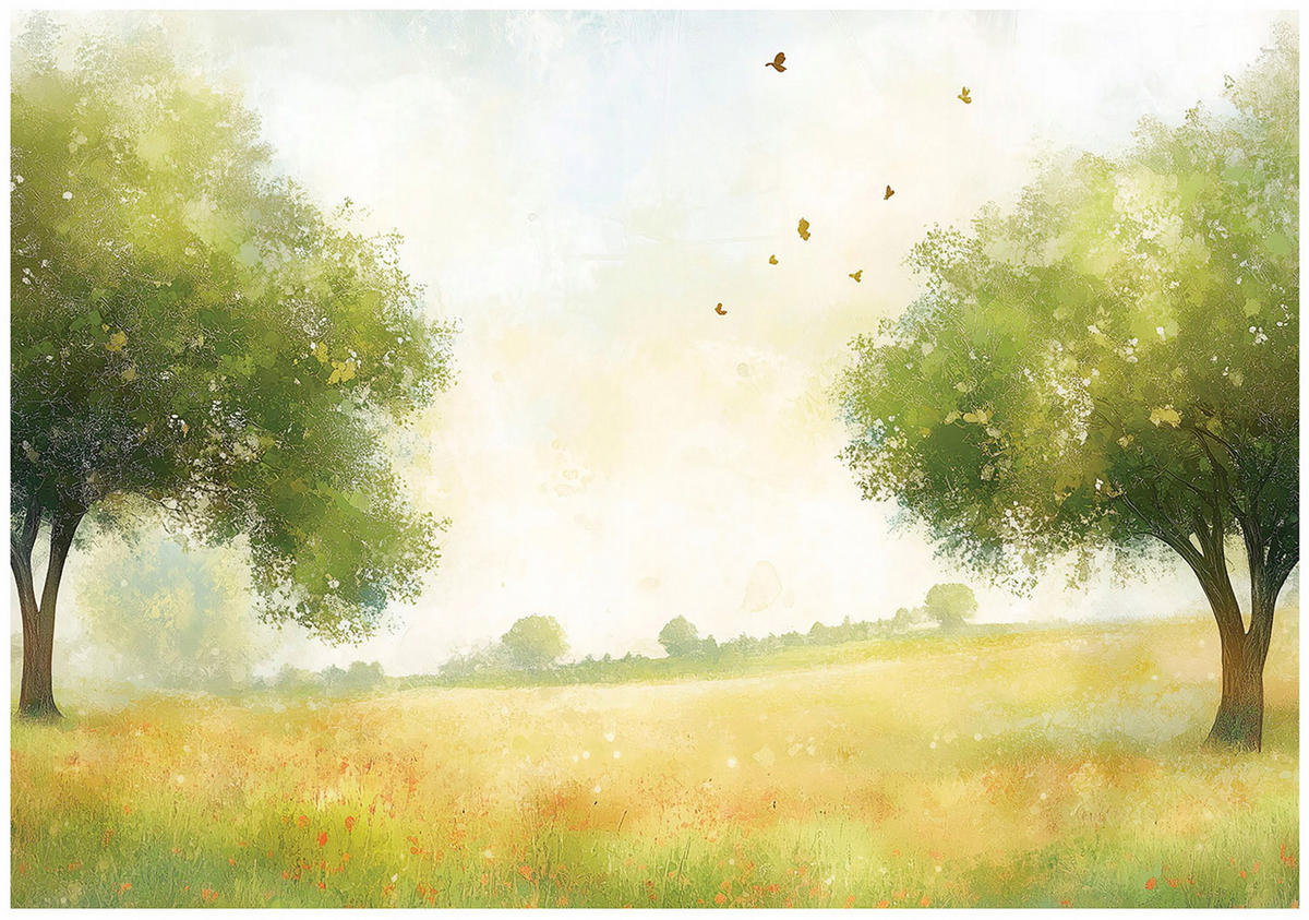 FOTOTAPETE 3D Effekt Wiese Bäume Pastellfarben 200x140 - Vlies Fototapete mit KleisterFOTOTAPETE FÜR WOHNZIMMER UND SCHLAFZIMMER : Sie zeichnen sich durch ihre Formstabilität und Strapazierfähigkeit aus, was sie zur idealen Wahl für jede Wand in Ihrem Zuhause macht. Egal ob im Wohnzimmer, Schlafzimmer, Büro oder in der Küche, diese Fototapeten verleihen jedem Raum eine stilvolle und beeindruckende Atmosphäre..
