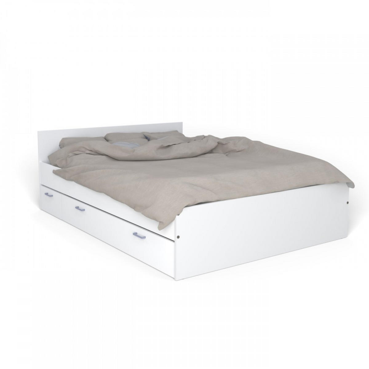 Bett TWIST 140x190 + Konsolen + Schublade / WeißDas Bett Twist verleiht dem Schlafzimmer eine komfortable und praktische Seite. Es besteht aus 1 großen Schublade und ermöglicht es, den Stauraum im Schlafbereich leicht zu optimieren. Es verfügt sogar über einen Nachttisch auf Rollen, den man im Handumdrehen unter das Bett schieben kann, um mehr Platz im Zimmer zu schaffen! Dank seines schlichten und klaren Designs ist das Bett Twist ein zeitloser Klassiker, der zu jedem Einrichtungsstil passt.Merkmale : - Struktur aus Spanplatte.- Ausführung: weiß- Maße Nachttisch: B40xT39xH21 cm - Innenmaße: B34XP33xH15 cm.- Abmessungen Schublade: L150xP39xH21 cm - Innenmaße: L146xP33xH16cm.Wird zerlegt ohne Lattenrost geliefert, bitte Lattenrost mit Rahmen vorsehen.