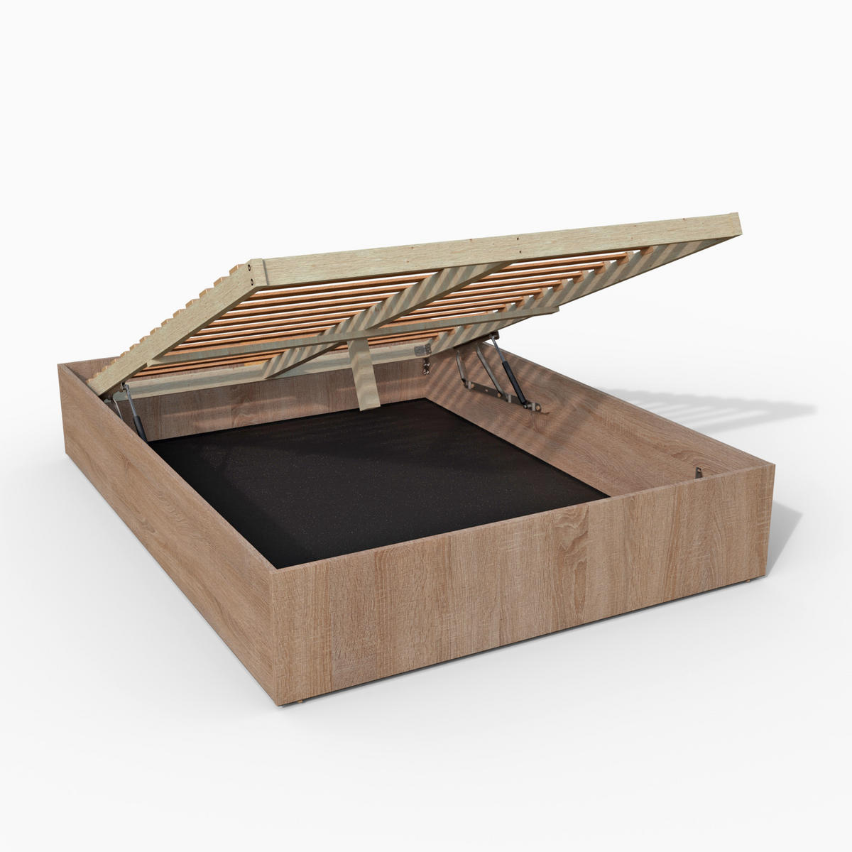 BETTKASTEN BILBAO 140x190 cm mit Lattenrost Struktur aus Spanplatte, gebleichtes Eichenholzdekor. Lattenrost mit 15 Mehrschichtholzlatten. Querschnitt 52x8 mm. Wird zerlegt geliefert, ohne Matratze.