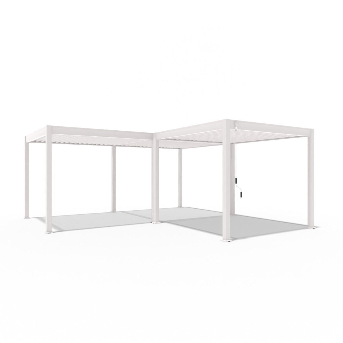 Diese L-Form Aluminium-Pergola in Weiß besteht aus zwei einzelnen Pergolen: einer 3x6 m Deluxe-Ausführung aus Aluminium sowie einer 3x3 m Classic-Ausführung mit Aluminiumgestell und verzinkten Stahllamellen. Beide Elemente werden mithilfe des mitgelieferten 3 Meter langen Verbindungskits zu einer 6x6 m L-Form kombiniert.