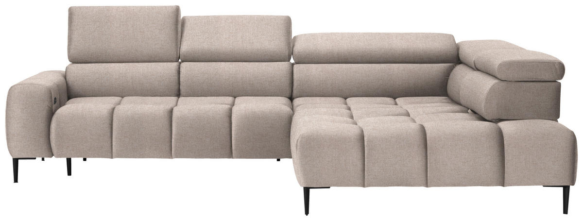 Genießen Sie Ihr Rendezvous mit der wohligen Unbeschwertheit des Seins auf diesem beigen Ecksofa mit Webstoff-Bezug!