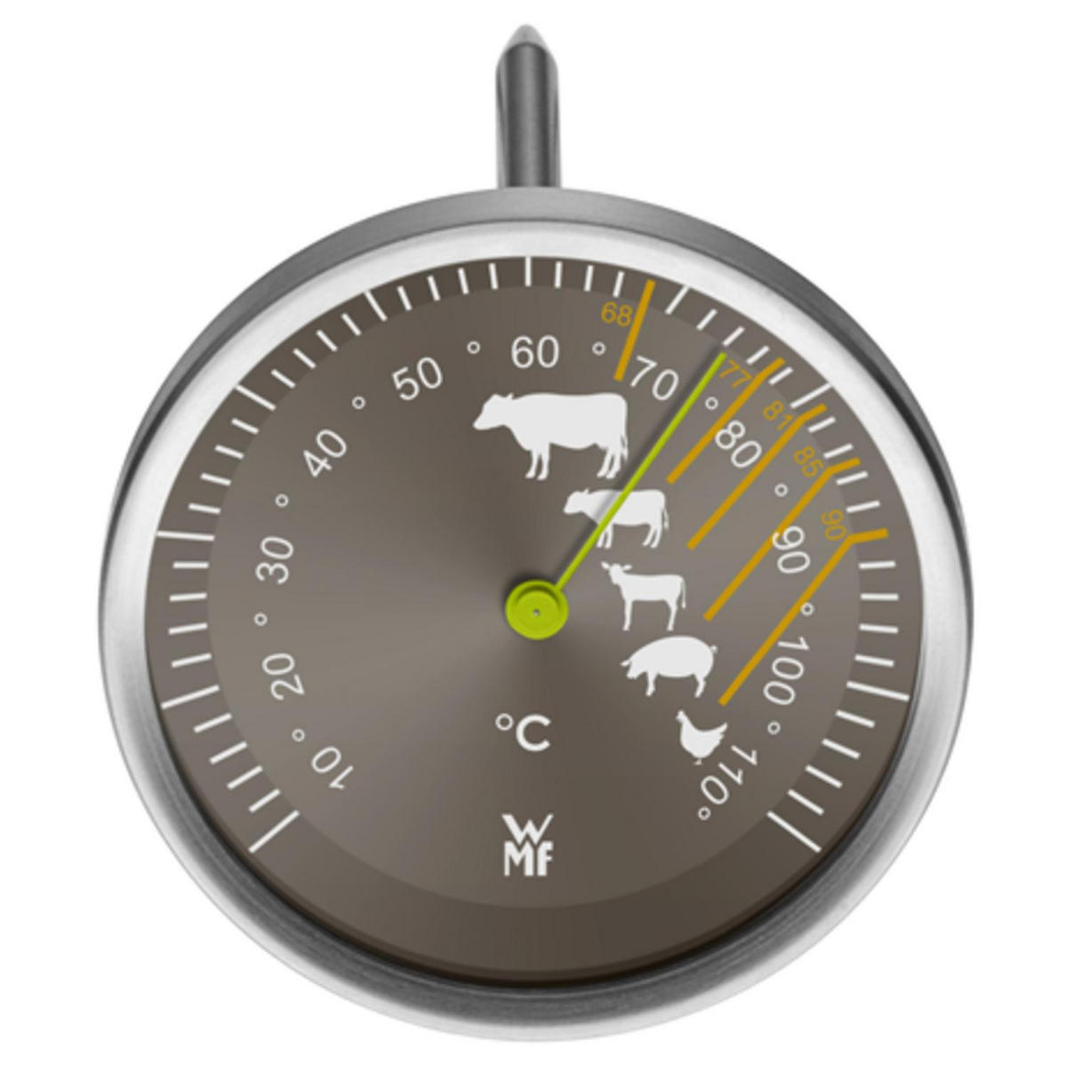Dieser Bratenthermometer (0608636030) sorgt für eine zielgenaue Zubereitung Ihrer Lieblingsspeisen. Egal ob Rind, Lamm, Wild, Schwein oder Huhn: Mit diesem spülmaschinengeeigneten Wärmemesser gelingen Fleischgerichte einfacher. Dabei ist der Temperaturmesser aus Cromargan und Glas bis ca. 250° C hitzebeständig. Verlassen Sie sich auf diesen hochwertig verarbeiteten Bratenthermometer von WMF!