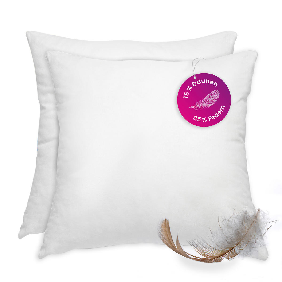 Unser Federkissen der PREMIUM-line ist ein hochwertiges Füllkissen mit Feder- und Daunenfüllung. Hier erhalten Sie ein praktisches 2-teiliges Set. Wenn Sie auf der Suche nach einem hochwertigen Sofakissen sind, das nicht nur bequem, sondern auch langlebig ist, dann ist unser Federkissen mit 15%igem Daunenanteil genau das Richtige für Sie. Die Füllung des Federkissens besteht zu 85% aus Federn, zu 15% aus Daunen und es hat einen Bezug aus 100% Baumwolle, in der Farbe weiß. Das Kissen ist maschinenwaschbar bei 40°. Außerdem stammen die Federn nicht aus Lebendrupf. Unsere Federkissen sind auf 40°C in der Maschine waschbar und eignen sich somit ideal für den täglichen Gebrauch. Dank des Baumwoll-Bezugs bleibt das Kissen angenehm weich und atmungsaktiv. Der Bezug aus reiner Baumwolle sorgt für ein angenehmes Schlafklima. Bitte beachten Sie, dass die Kissenfüllungen produktionsbedingt regulär ein wenig kleiner ausfallen können (etwa 2 cm).