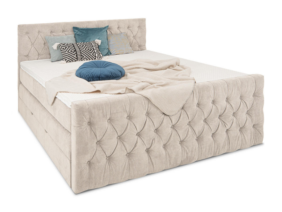 Das Boxspringbett LONDON bietet Dir einen traumhaften Komfort und dazu noch jede Menge Stauraum. Das weich gepolsterte Kopfteil im Chesterfield-Design eignet sich ideal zum Entspannen und macht das Doppelbett, zusammen mit dem modernen Fußteil, zum Mittelpunkt in jedem Schlafzimmer. Durch den herrlich weichen, aber dennoch strapazierfähigen Stoffbezug erhält das Bett ein elegantes Design und wird gleichzeitig zu Deinem langjährigen Begleiter. Durch den 3-schichtigen Aufbau aus Bonellfederkern-Box, komfortabler Taschenfederkern-Matratze und Topper passt sich das Boxspringbett dem Körper perfekt an und sorgt so für beste Voraussetzungen zu einem erholsamen Schlaf. Hier hast Du die Wahl zwischen den Taschenfederkern-Wendematratzen im Härtegrad H2/H3 (0 - 100 kg Körpergewicht) oder den Taschenfederkern-Wendematratzen im Härtegrad H3/H4 (101 - 120 kg Körpergewicht). Somit kann das Liegegefühl der Wendematratzen durch ein einfaches Wenden individuell angepasst werden kann.
