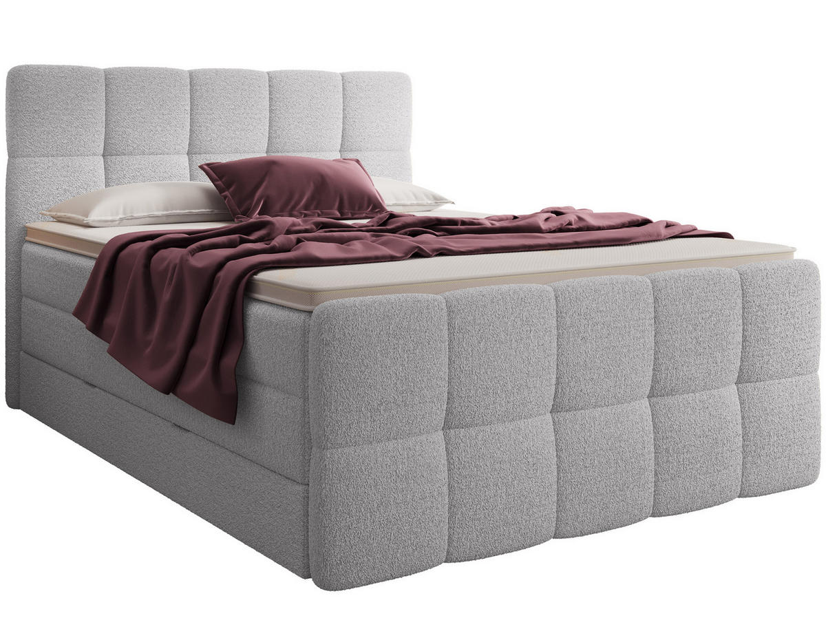 Das Boxspringbett MADISON 2 bietet dir einen traumhaften Komfort und dazu noch jede Menge Stauraum. Das weich gepolsterte Kopfteil eignet sich ideal zum Entspannen und macht das Doppelbett zum Mittelpunkt im Schlafzimmer. Durch den herrlich weichen, aber dennoch strapazierfähigen Boucle-Stoffbezug erhält das Bett ein besonders elegantes Design und wird gleichzeitig zu deinem langjährigen Begleiter. Das zusätzliche Fußteil verleiht dem Bett nicht nur einen besonders ruhigen und modernen Look, sondern sorgt zusätzlich dafür, dass Matratzen und Topper auf Ihrem Platz bleiben.