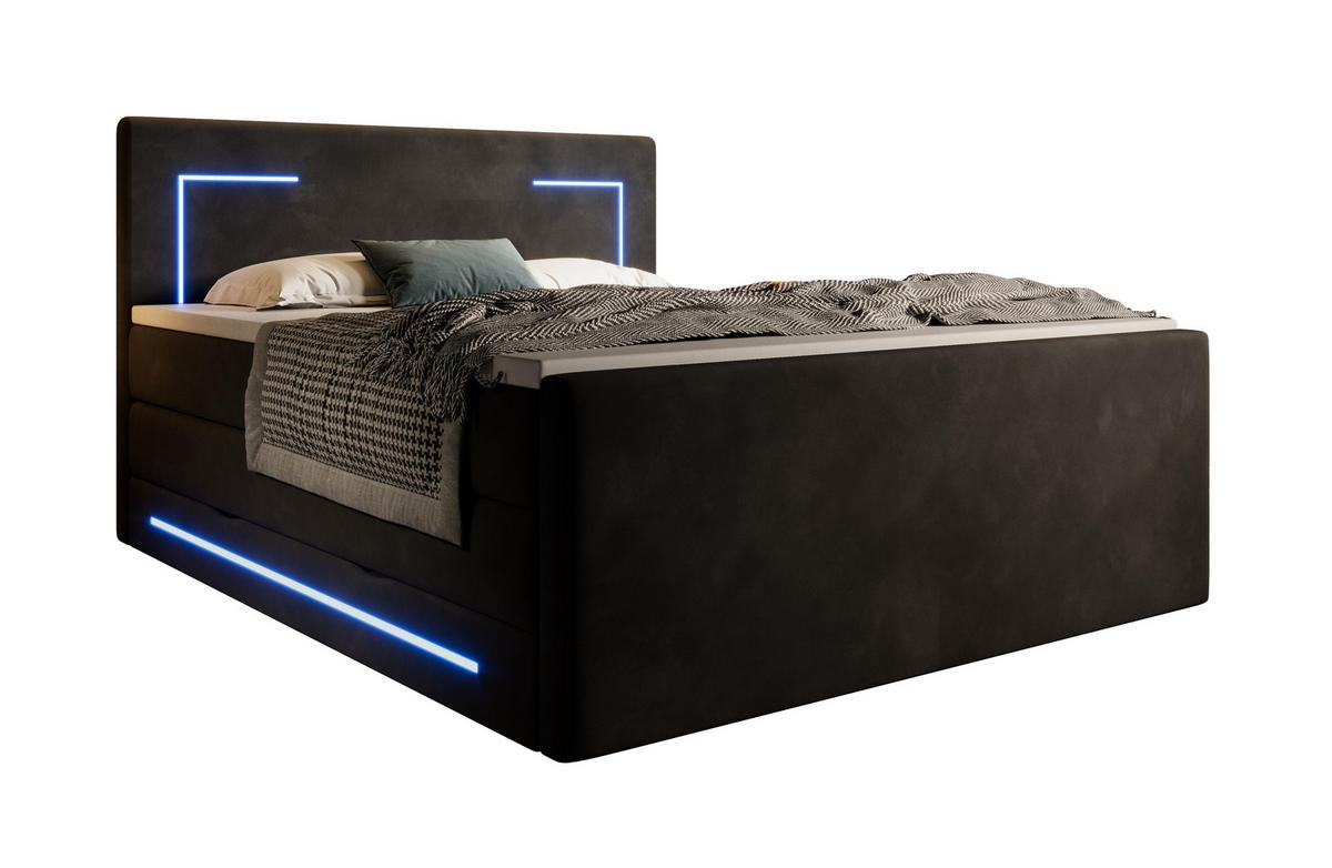 LED Beleuchtung in blau Hoher Schlafkomfort Mit Topper Liegehöhe ca. 66 cm inkl. Topper MONACO Boxspringbett mit Bettkasten Monaco Boxspringbett - Der Hingucker in jedem Schlafzimmer. Durch den 3-schichtigen Aufbau aus Bonellfederkern-Box, komfortabler Taschenfederkern-Matratze und Topper passt sich das Boxspringbett dem Körper perfekt an und sorgt so für beste Voraussetzungen zu einem erholsamen Schlaf. Durch die hochwertige Wendematratze kann, durch ein einfaches Wenden der Matratze, der Härtegrad individuell bestimmt und genau auf deine Bedürfnisse abgestimmt werden. Für dein perfektes Schlaferlebnis hast du dabei die Wahl zwischen zwei verschiedenen Varianten. Während sich der Härtegrad H2/H3 ideal für ein Körpergewicht bis 100 kg eignet, empfehlen wir dir den Härtegrad H3/H4 bei einem Körpergewicht von ca. 100-120 kg. Das Boxspringbett ist allerdings nicht nur gemütlich, sondern macht auch optisch einiges her. Die blaue LED Beleuchtung im 90 Grad Design sorgt für ein besonders angenehmes, stimmungsvolles Licht und macht das Bett zum Mittelpunkt im Schlafzimmer. Das zusätzliche Fußteil im weichen Samt-Stoff verleiht dem Bett nicht nur eine besonders ruhige und ansprechende Optik, sondern sorgt zusätzlich dafür, dass Matratzen und Topper auf Ihrem Platz bleiben. Das Monaco Boxspringbett mit LED-Beleuchtung und Bettkasten - setzt neue Akzente in deinem Schlafzimmer. Wahlweise in: Boxspringbett 160x200 cm mit Bettkasten Boxspringbett 180x200 cm mit Bettkasten Boxspringbett 200x200 cm mit Bettkasten