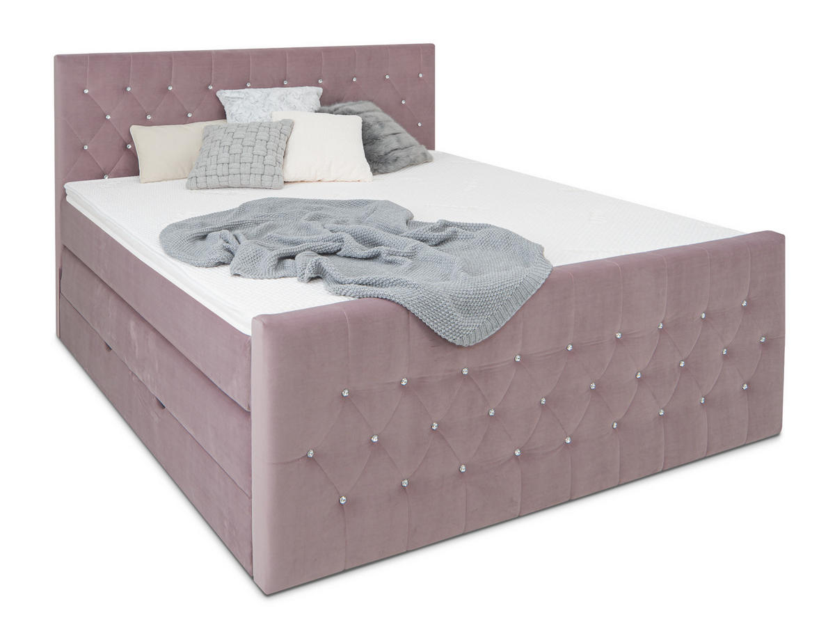 Das Boxspringbett SIRA bietet dir ein besonders elegantes Design und einen traumhaften Komfort. Durch den 3-schichtigen Aufbau aus Bonellfederkern-Box, komfortabler Taschenfederkern-Matratze und Topper passt sich das Boxspringbett dem Körper perfekt an und sorgt so für beste Voraussetzungen zu einem erholsamen Schlaf. Hier hast Du die Wahl zwischen den Taschenfederkern-Wendematratzen im Härtegrad H2/H3 (0 - 100 kg Körpergewicht) oder den Taschenfederkern-Wendematratzen im Härtegrad H3/H4 (101 - 120 kg Körpergewicht). Somit kann das Liegegefühl der Wendematratzen durch ein einfaches Wenden individuell angepasst werden kann. Highlight des Bettes sind dabei die einzigartigen Kristallsteine im Kopf- und Fußteil. In Kombination mit dem edlen und besonders weichen Samt-Stoff verleiht das Boxspringbett deinem Schlafzimmer einen besonders luxuriösen Look.