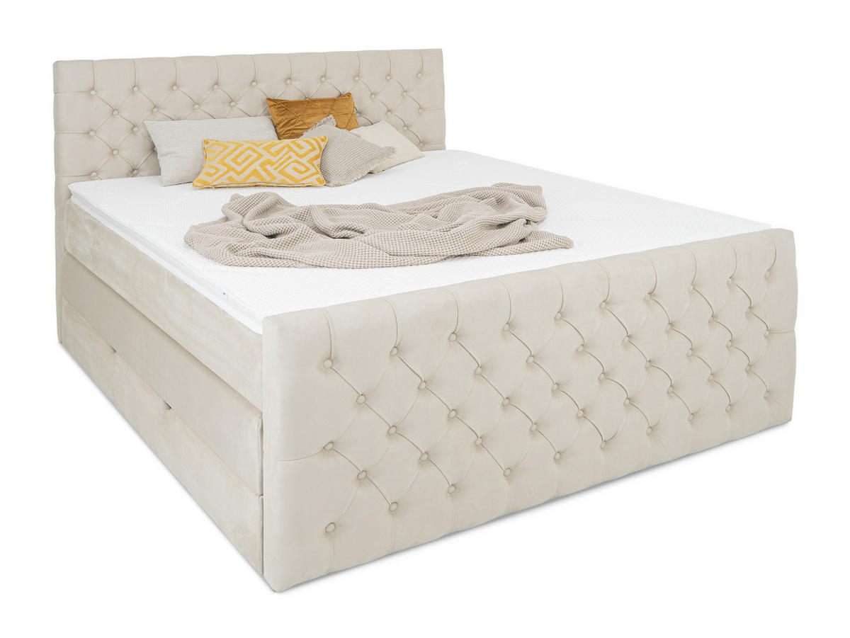 Das Boxspringbett VICTORIA bietet dir ein besonders elegantes Design und einen traumhaften Komfort. Das Liegegefühl bestimmst du dabei selbst. Durch ein einfaches Wenden der Matratze, kann der Härtegrad individuell bestimmt und genau auf deine Bedürfnisse abgestimmt werden. Durch den 3-schichtigen Aufbau aus Bonellfederkern-Box, komfortabler Taschenfederkern-Matratze und Topper passt sich das Boxspringbett dem Körper perfekt an und sorgt so für beste Voraussetzungen zu einem erholsamen Schlaf. Hier hast Du die Wahl zwischen den Taschenfederkern-Wendematratzen im Härtegrad H2/H3 (0 - 100 kg Körpergewicht) oder den Taschenfederkern-Wendematratzen im Härtegrad H3/H4 (101 - 120 kg Körpergewicht). Somit kann das Liegegefühl der Wendematratzen durch ein einfaches Wenden individuell angepasst werden kann. Der weiche Samtstoff in Kombination mit der handgefertigten Steppung verleiht dem Boxspringbett einen besonders edlen Look und macht das Bett zum Mittelpunkt in jedem Schlafzimmer.