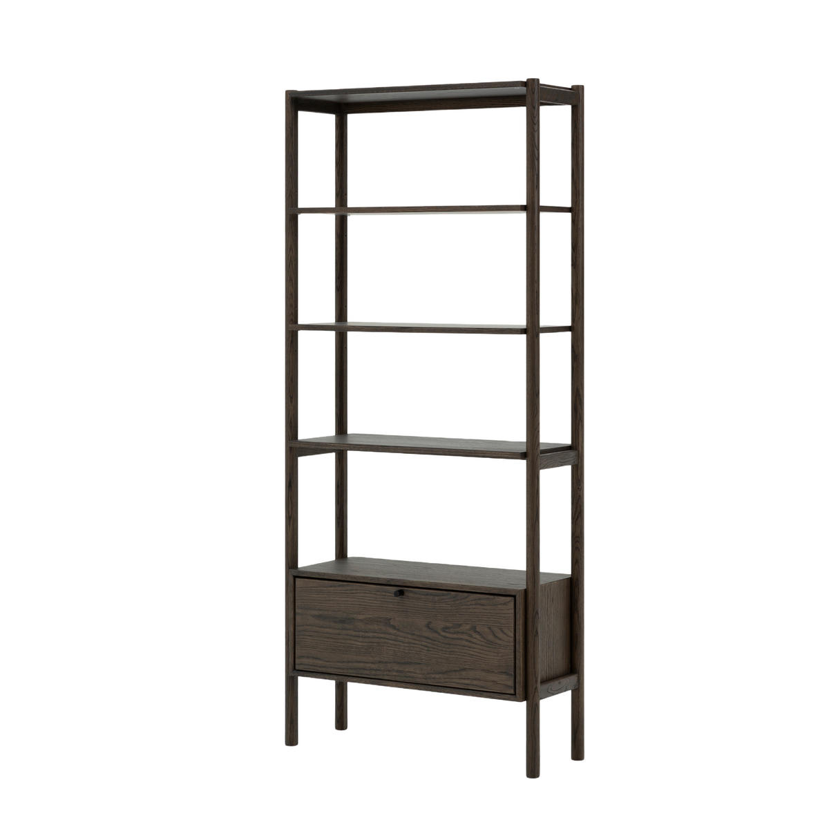 Das Bücherregal FRANZ aus Eiche mit Espresso-Finish überzeugt mit zeitlosem und luftigen Design. Es kombiniert massives Eichenholz mit Eichenfurnier und bietet dadurch Stabilität und Langlebigkeit. Komplett von Hand gefertigt, zeigt es handwerkliche Präzision und hebt die authentische Schönheit des Holzes hervor. Die integrierte Schublade mit Soft-Close-Mechanismus sorgt für leises und komfortables Schließen. Die matte Espresso-Lackierung schützt das Holz und unterstreicht seinen eleganten, natürlichen Charakter.