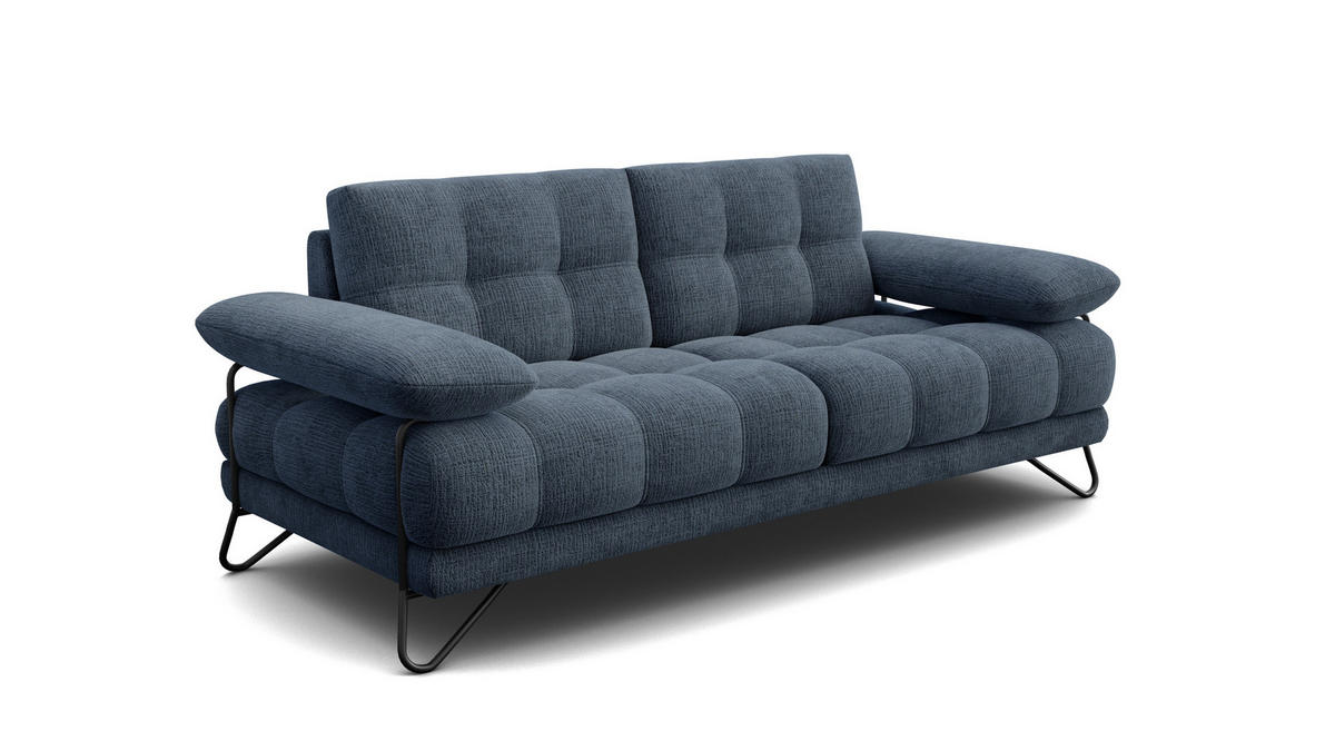 Maße: 215 x 87 x 96 cm, 47 kg. Sitzhöhe: 47 cm, Sitztiefe: 59 cm.Anzahl der Pakete: 1 St. 218x99x63cm, 48kg. Keine Montage erforderlich.Die Füße: 16 cm, schwarz. Erfordert Montage. Stoff: Weiches, flauschiges und angenehm anzufassendes Chenill-Gewebe mit klarer Textur. 100% Poliester, 330 g/m2, 45.000 Martindale, pilling resistance: 4-5, lightfastness: 5, marineblau.Modernes Design, einzigartiges Aussehen, auffällige Beine. Die Serie Bubbara besticht durch die markante Steppung der Sitzfläche und Rückenlehne, die rhythmische, geometrische Unterteilungen bildet. Die einfarbige Polsterung unterstreicht die Weichheit der Form und bildet gleichzeitig einen schönen Kontrast zu den ungewöhnlichen, metallenen, schleifenförmigen Beinen, einem charakteristischen Element moderner Designs mit industriellem Touch. Die Armlehnen sind massiv, aber höher angebracht und ragen leicht über den Korpus hinaus, was dem gesamten Möbelstück Leichtigkeit und visuelle Originalität verleiht.