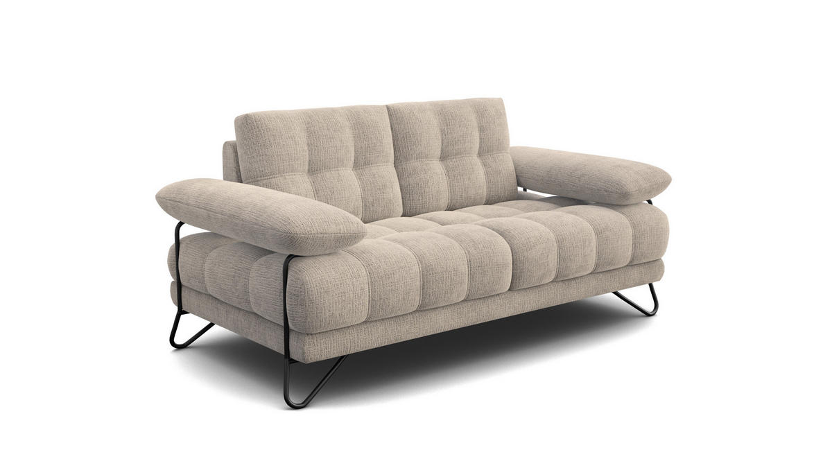 Maße: 185 x 87 x 96 cm, 40 kg. Sitzhöhe: 47 cm, Sitztiefe: 59 cm.Anzahl der Pakete: 1 St. 188x99x63cm, 41kg. Keine Montage erforderlich.Die Füße: 16 cm, schwarz. Erfordert Montage. Stoff: Weiches, flauschiges und angenehm anzufassendes Chenill-Gewebe mit klarer Textur. 100% Poliester, 330 g/m2, 45.000 Martindale, pilling resistance: 4-5, lightfastness: 5, beige.Modernes Design, einzigartiges Aussehen, auffällige Beine. Die Serie Bubbara besticht durch die markante Steppung der Sitzfläche und Rückenlehne, die rhythmische, geometrische Unterteilungen bildet. Die einfarbige Polsterung unterstreicht die Weichheit der Form und bildet gleichzeitig einen schönen Kontrast zu den ungewöhnlichen, metallenen, schleifenförmigen Beinen, einem charakteristischen Element moderner Designs mit industriellem Touch. Die Armlehnen sind massiv, aber höher angebracht und ragen leicht über den Korpus hinaus, was dem gesamten Möbelstück Leichtigkeit und visuelle Originalität verleiht.