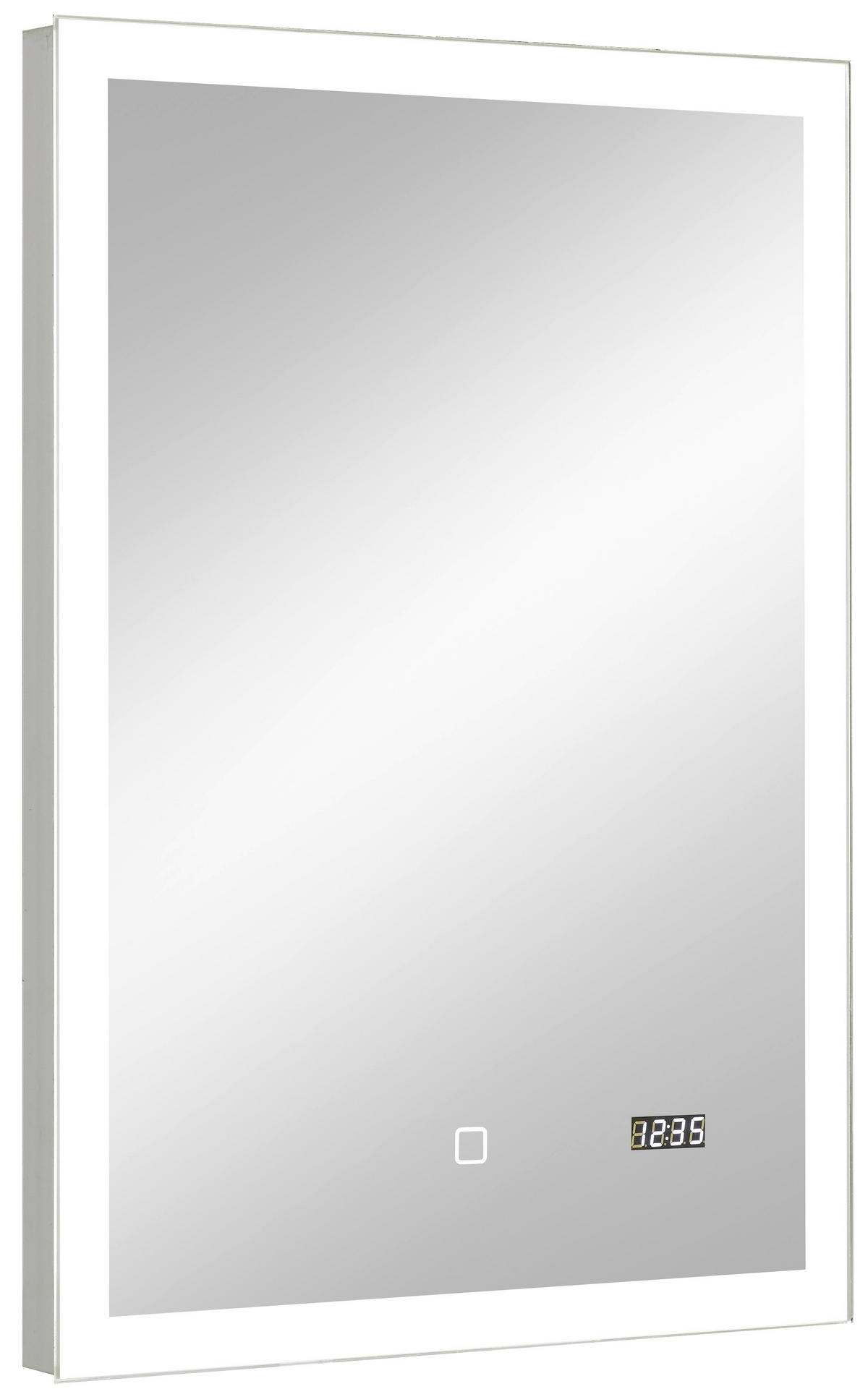 Ein Badaccessoire mit außergewöhnlicher Ausstrahlung ist dieser rechteckige Spiegel. Mit Beleuchtung und Uhr bringt er die besten Voraussetzungen mit, um zum Highlight der Einrichtung zu avancieren. Per Touchsensor wird das Licht eingeschaltet, das Ihr Spiegelbild beim Stylen einrahmt.