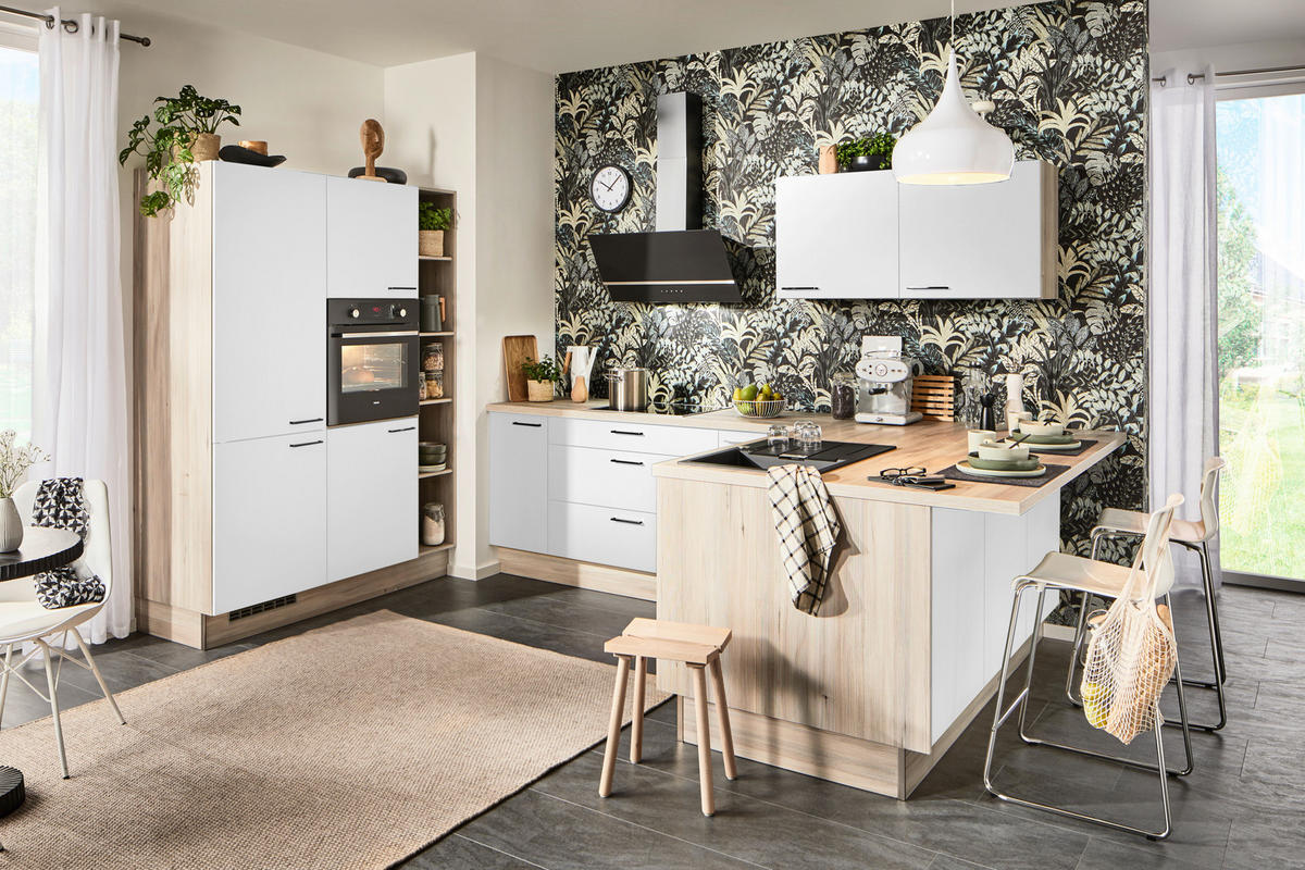 - Nicht im Lieferumfang enthalten: Beleuchtung, Besteckeinsatz, E-Geräte, Lichtleiste, Mülltrennsystem, Nischenrückwand, Sockellade, Spüle, Ab- und Überlaufgarnitur