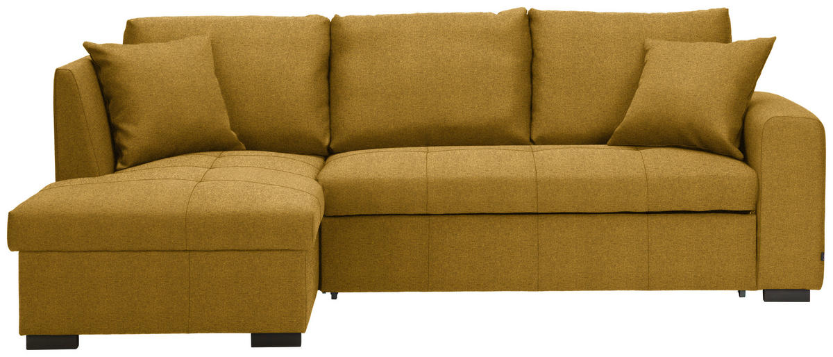Eine Sonderportion Wohnlichkeit schenkt Ihnen dieses dunkelgelbe Ecksofa mit Webstoff-Bezug. Greifen Sie zu!